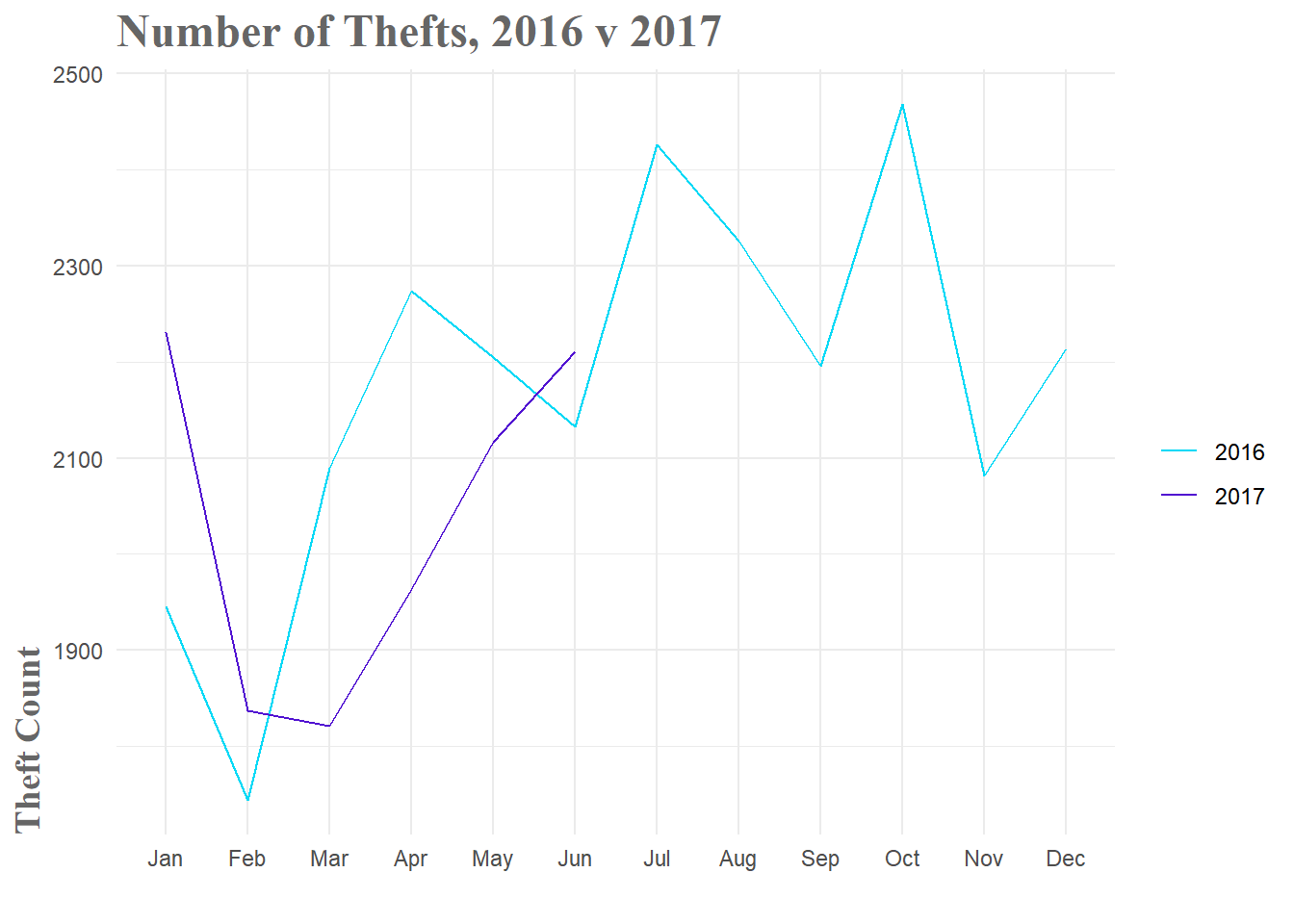 As with any modeling, you need to have a baseline against which to compare your forecasts. In our case, this can be something as simple as predicting the same number of thefts in January of 2017 as there were in January of 2016–also known as a seasonal naive model. This is actually a fairly common strategy in police departments around the country when they are attempting to forecast crime for resource allocation. We hope that we can do much better than these naive models, but if we can’t, we know to go back to the drawing board.