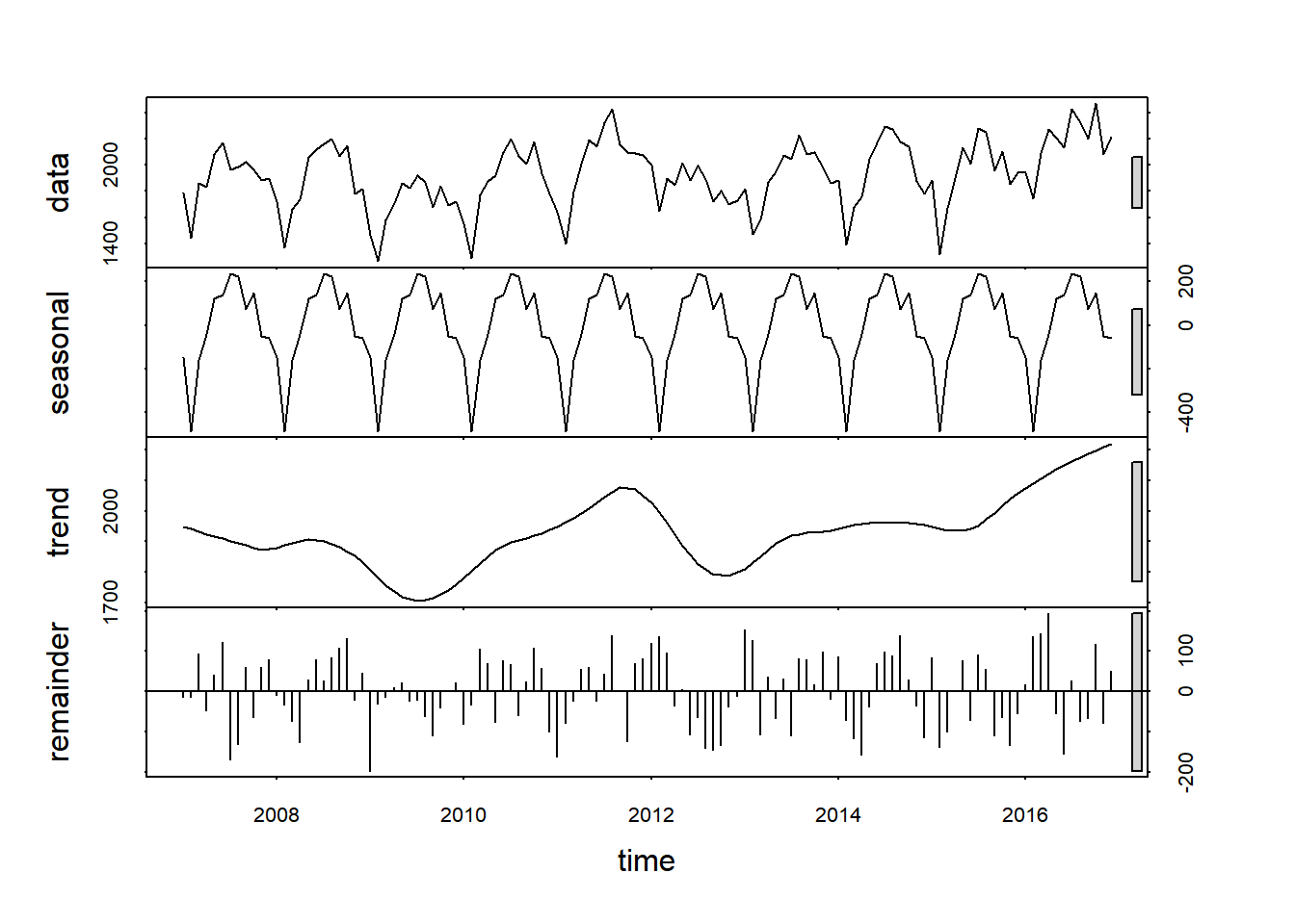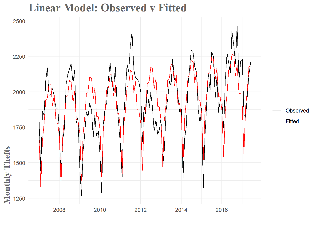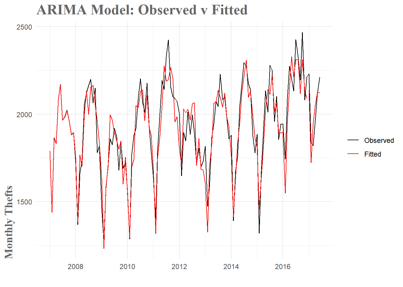 Fig.4 shows us the original data and then breaks it down into the seasonal, trend and remainder components. I can clearly see both the monthly seasonal pattern and the general upward trend of the number of thefts. Of particular note are the grey bars on the right hand side. Basically, the smaller the bar, the more important the component in explaining the overall data. So in our case, the seasonal component seems to explain more of the variation than the trend component. It should also be noted that the remainder portion (variation in the data that is not explained by the seasonal or trend components) does not appear to be randomly distributed. In fact, if I squint a bit, it almost looks like a sine wave. If this model captured all the available information, I would see randomly distributed remainders. Since this isn’t the case, it is highly likely that there is useful information left that the model is not capturing.