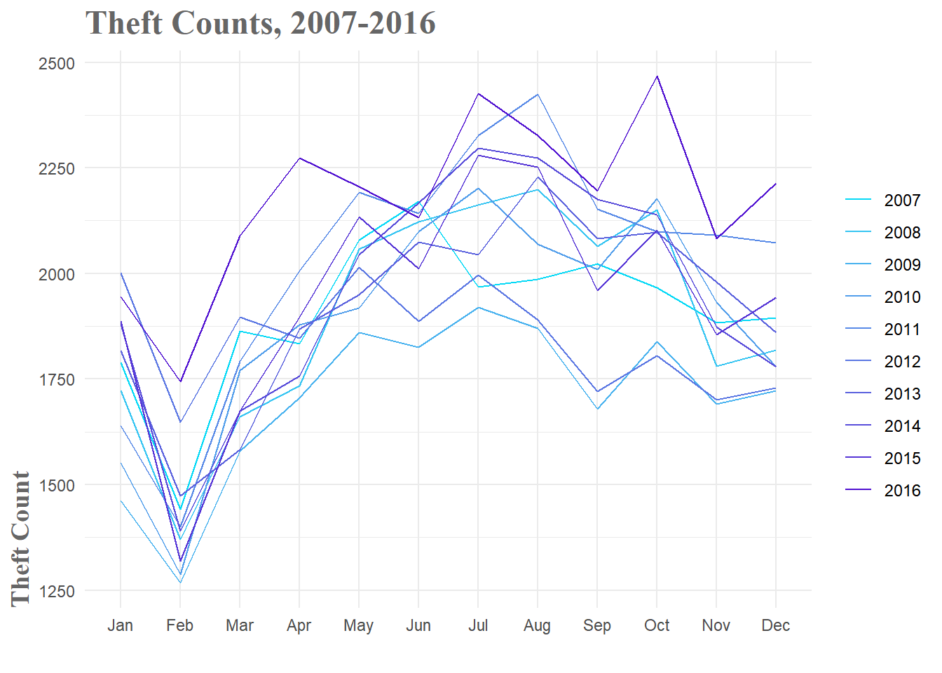When you break the data down by year, this ebb and flow pattern becomes a little more clear. The early, winter weeks tend to have relatively low theft numbers and then you see a gradual increase through the spring and summer. After a peak towards the end of summer, thefts gradually drop off through fall and the beginning of winter. The variance you see between the years must be a combination of other factors, but the basic seasonal pattern is consistent over the years and therefore should be informative in our models.