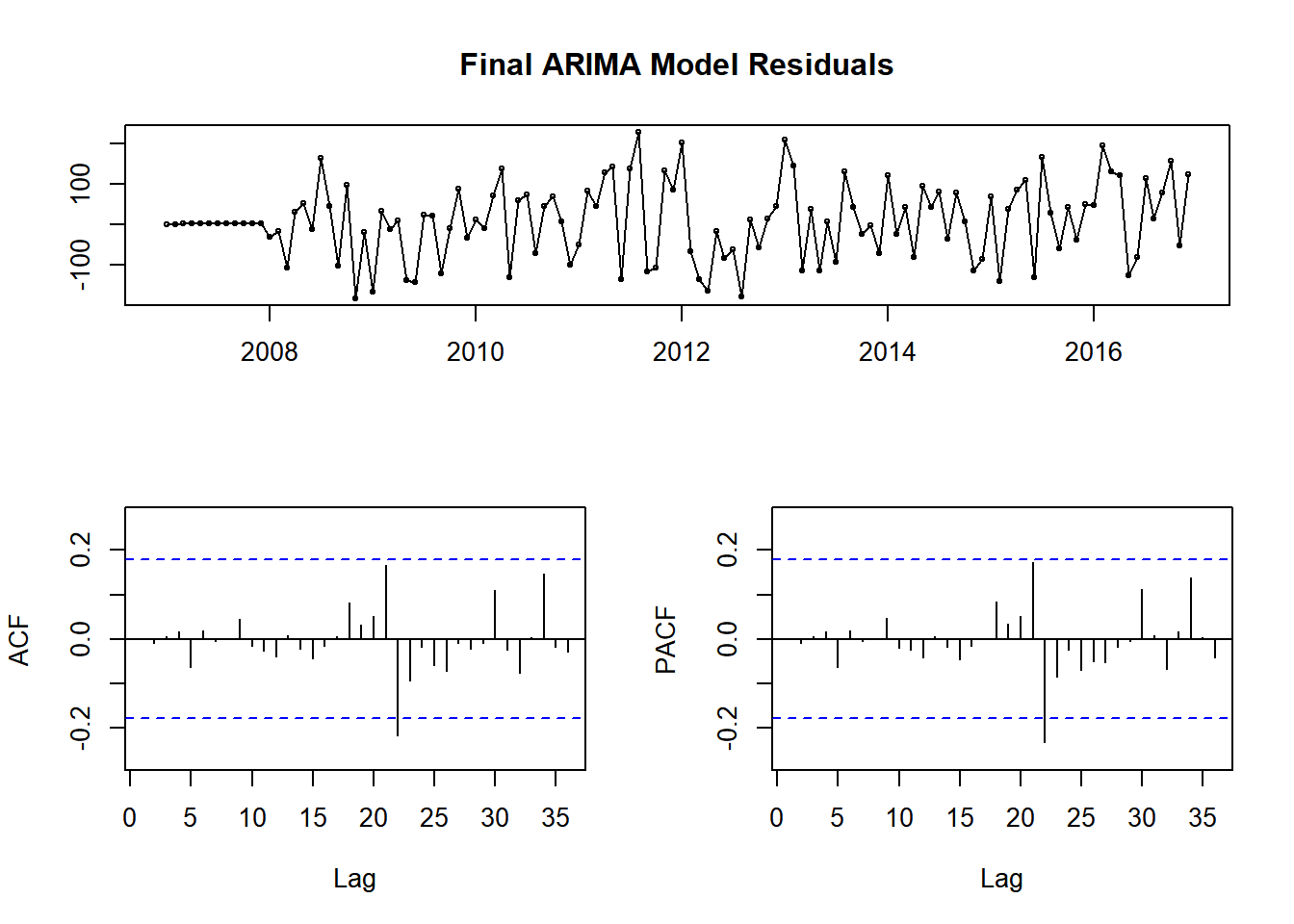Looking at the top plot of the residuals themselves, portions of it appear random(as it should if we captured all the information) and other parts have clear trends present. This is highlighted again in the Acf and Pacf correlation plots. Essentially, I have dealt with some of the information, but a good amount still remains. Let’s check out an ARIMA model to see if I can do a little better.