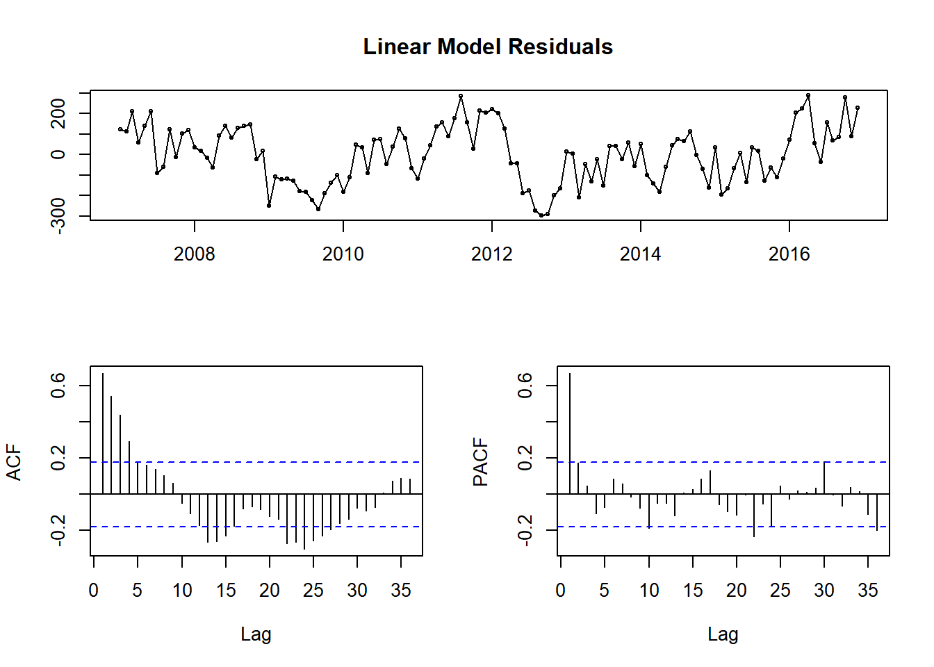 tsdisplay(fit.lm$residuals, main ="Linear Model Residuals")