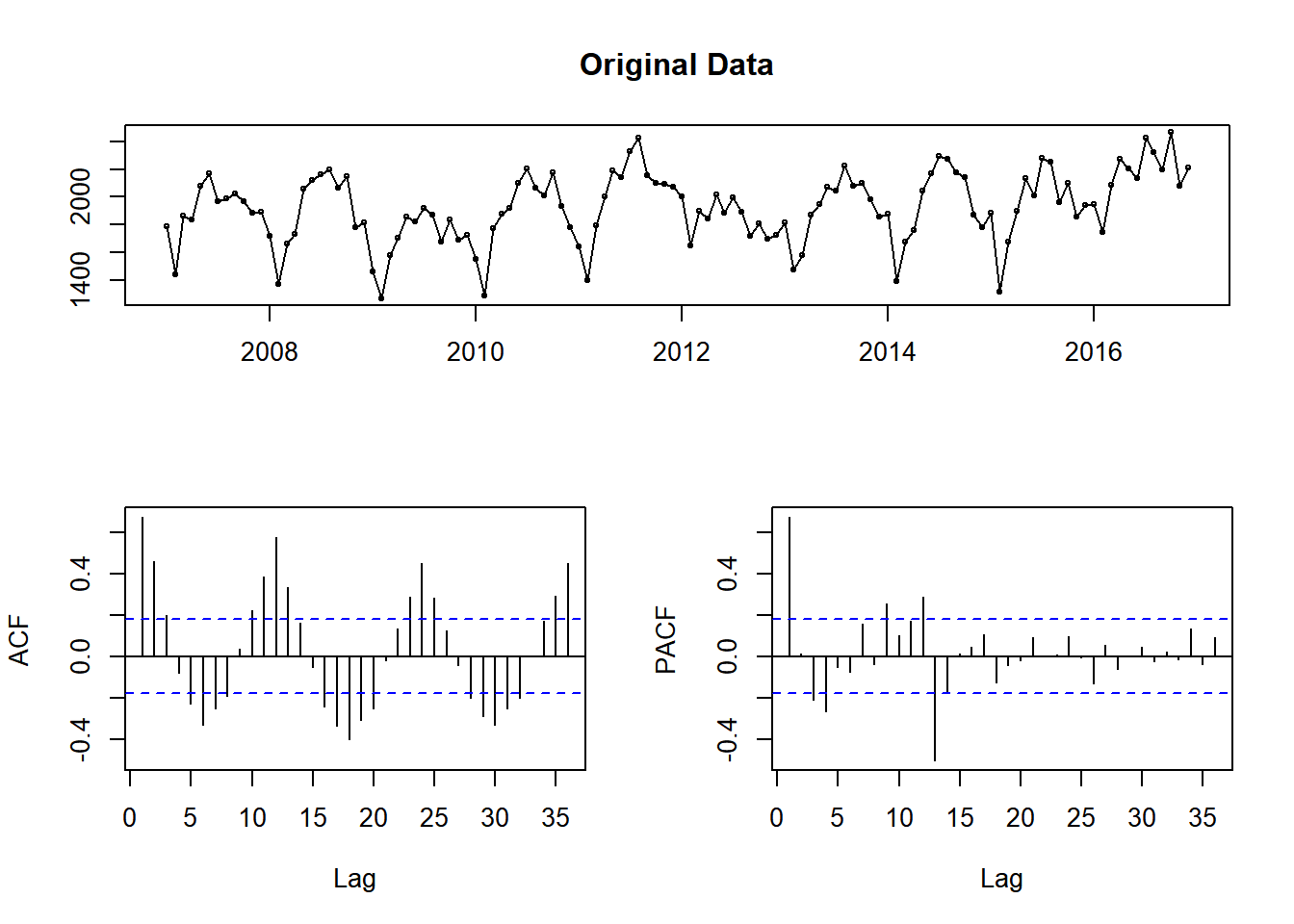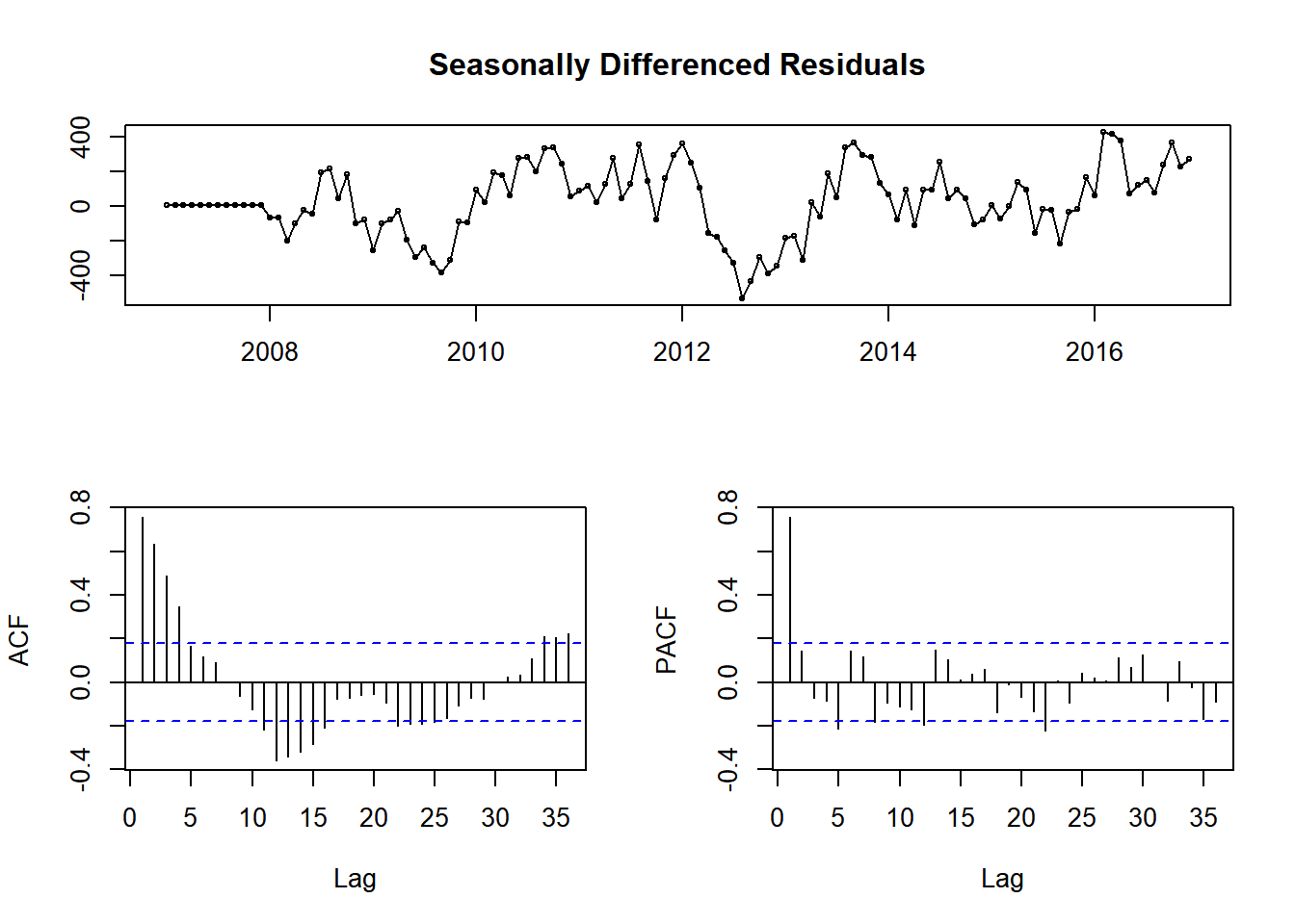 Since we have already seen that we have significant seasonality in our data, a seasonal ARIMA model is more appropriate. You specify this model in a similar manner – ARIMA(p, d, q)(P, D, Q)– where the second bracket contains the same information as above, but for the seasonal component. Behind the scenes, R will take this model and estimate our parameters using maximum likelihood estimation(MLE).