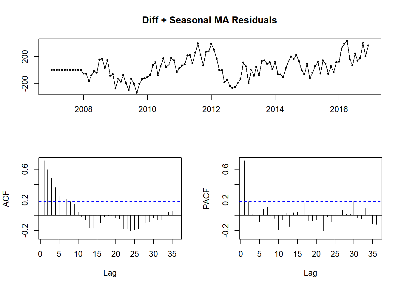 In Fig.10, you see the result of those two seasonal MA terms. I have removed the seasonal peaks at 12 and 24, but there are still large peaks at 1 on both plots, so some sort of AR terms are needed.