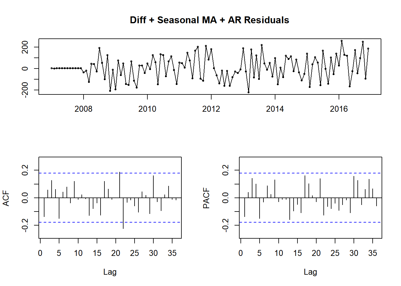 In Fig.9 you see a lot of significant peaks in both the Acf and Pacf plots, as well as what appears to be seasonal peaks at 12 and 24 months on the Pacf plot. Those seasonal peaks lead me to believe 2 seasonal MA terms might be appropriate.