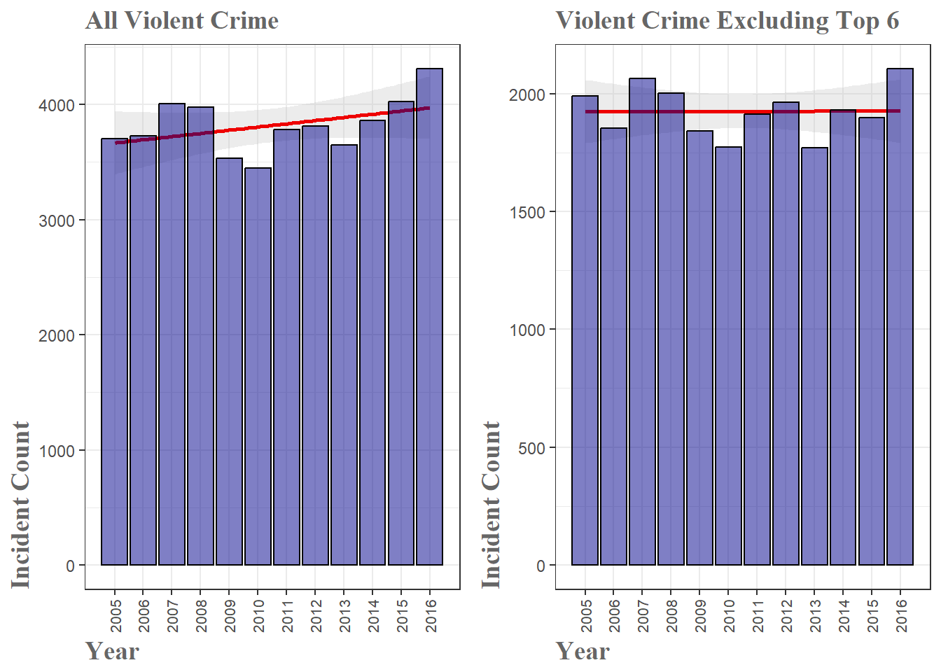 2016 was a year with a record number of homicides in Louisville. Seeing these reports every day was the genesis of this analysis, so it is only fitting to begin by exploring the most visceral of criminal offenses–violent crime. There are four offenses the FBI considers violent crime – murder and nonnegligent manslaughter, forcible rape, robbery and aggravated assault. As can be seen in the figure below, in the aggregate, a minor increase is apparent. The red trend line fit to the data has a slope of about 27 meaning (with this enormously oversimplified model) that we are seeing an increase of about 27 violent crime reports every year. However, as you can already see from the graph, the year-to-year variation is substantial making a simple trend line like this highly suspect.