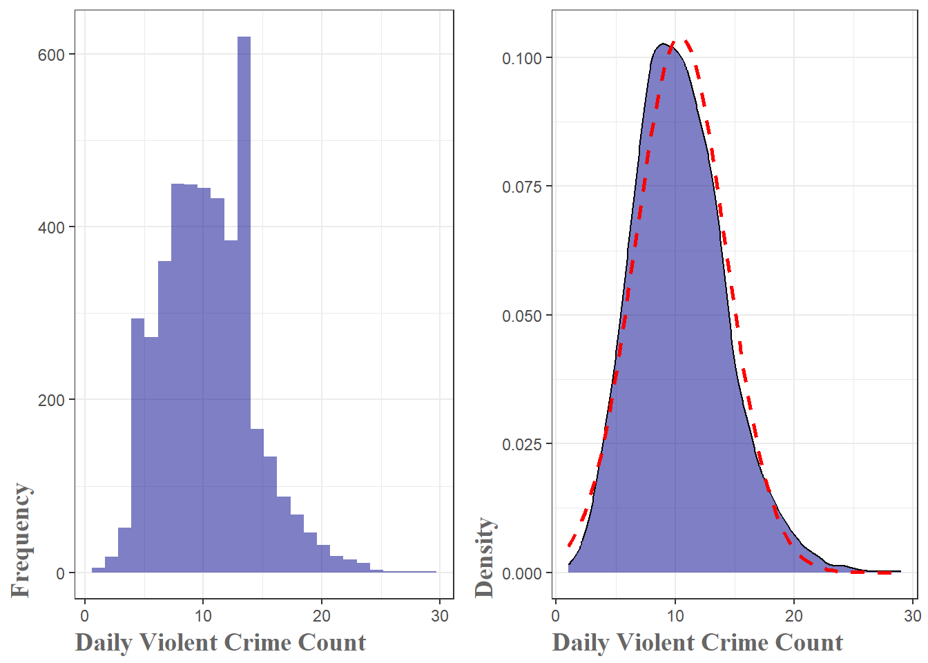 First, let’s look at the breakdown of violent crime by day. Both the histogram and the density plot show the same information, just in different ways. What we can see on both is that right around 10 violent crimes per day is most common. What the density plot shows a little better is the slight right-skewed shape to the distribution. It is approximately normal(the dotted red line), but with that right-skew which indicates higher counts have more probability associated with them.