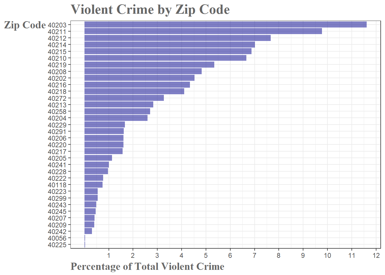 When we zoom in and break it down by year, we can see a minor, but visible, increase in the intensity of the heat map. Particularly from 2012-2016 we see a brightening of intensity in downtown Louisville. In 2016 in particular, it appears that we have expanding the downtown crime bubble ever so slightly, though this would warrent further analysis to determine anything concretely. What becomes apparent when viewing these breakdowns though is just how localized the violent crime is. When broken down by zip codes, it is shocking how skewed the numbers are. Just 6 of Louisville’s 66 zip codes account for 49.6% of all violent crime in Louisville. If we bump that up to the 12 zip codes, we cover 76.01% of violent crimes.