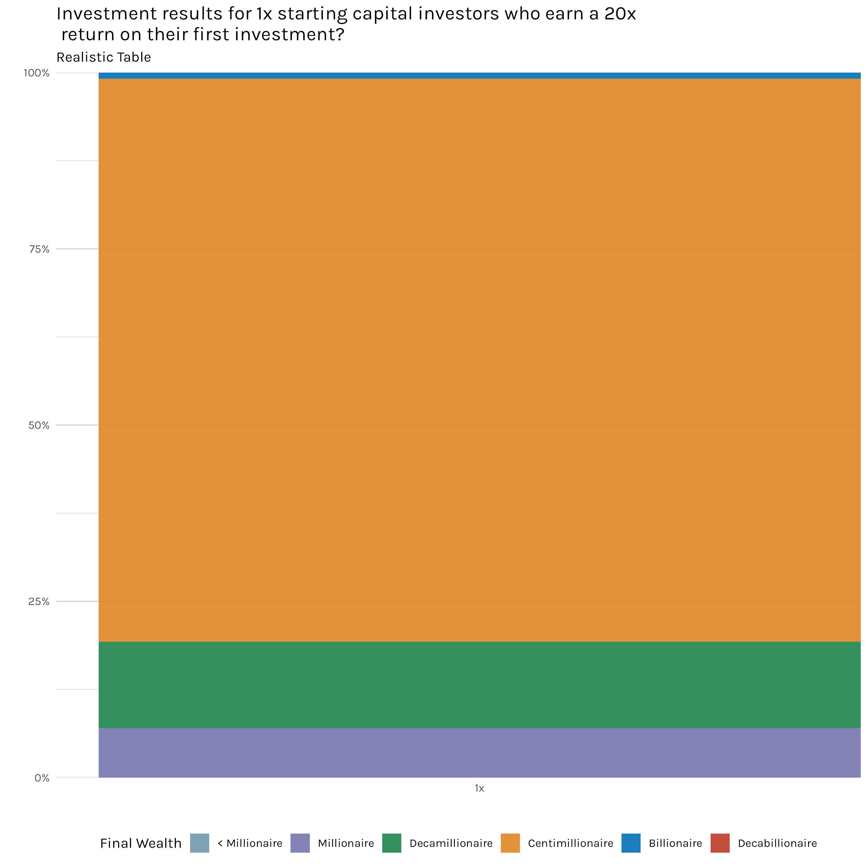 What if a 1x investor does get lucky and lands a 20x return on their first investment? In a sense, that would transform their situation from having to go all in every investment to something more akin to what the 20x investors are doing. We can actually look at this scenario by doing some filtering to look at just those 1x investors who got the maximum 20x return on their first investment of the simulation. This is ~2,000 investors. How did those investors end up faring? Pretty well according to Figure 12. These results look similar to the 20x capital investors we examined earlier. These appear even better, but that’s mainly because this is a small (Figure 12 only represents about 2,000 investors, while the bars from Figure 9 represent 100,000), and biased (Figure 12 is essentially showing the results of investors that we already know have won at least once) sample of the total investor group.