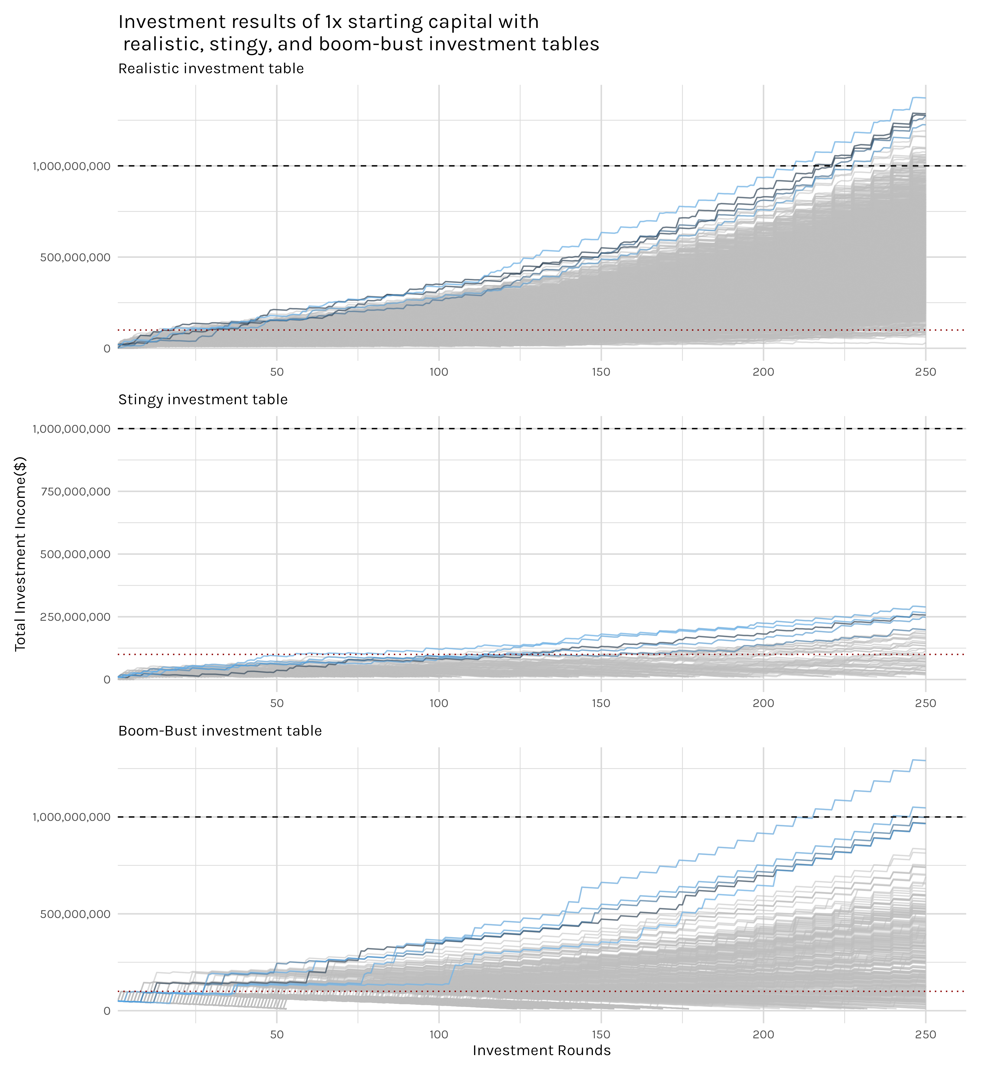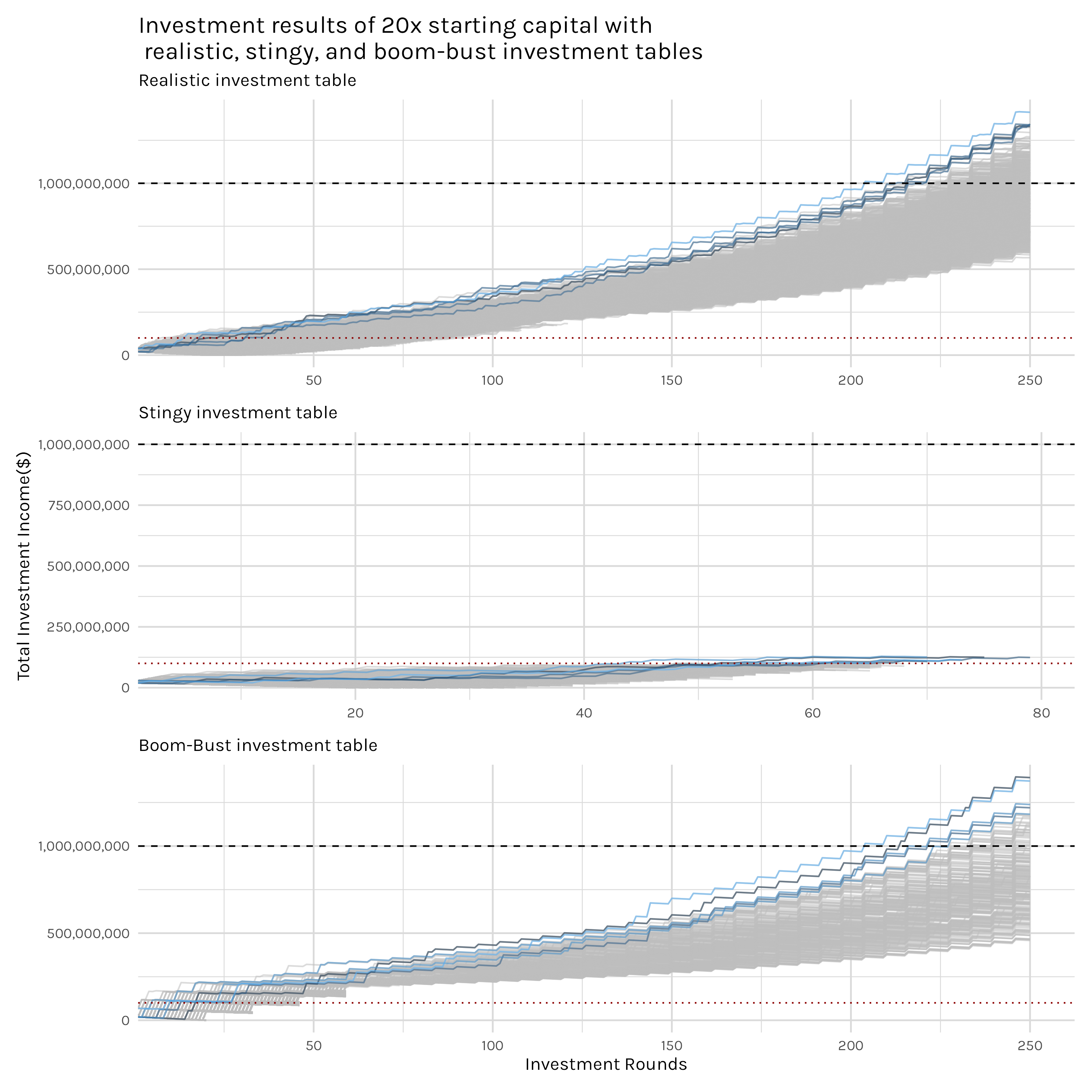 Looking at our 1x, 10x, and 20x starting capital variations, we immediately get a sense of the immense growth some investors will see. Remember, all of these investors are investing $1,000,000 per investment and starting with either $1,000,000, $10,000,000 or $20,000,000. Regardless of the starting capital, some investors in all the simulations accumulated over a billion dollars, with the five highest returns (lines colored with shades of blue) all easily hitting that mark. While all starting capital variations produced billionaires, the shape and spread of the plots tells us that they did not do so at the same rate. Looking at the right side of the plot, the top plot with 1x investment results clearly has a wider spread and has fewer lines above the billion dollar dashed line. The higher, and narrower, band of grey investor lines in the 10x and 20x plots indicate that, on average, the more starting capital you begin investing with, the higher your final income will be.
