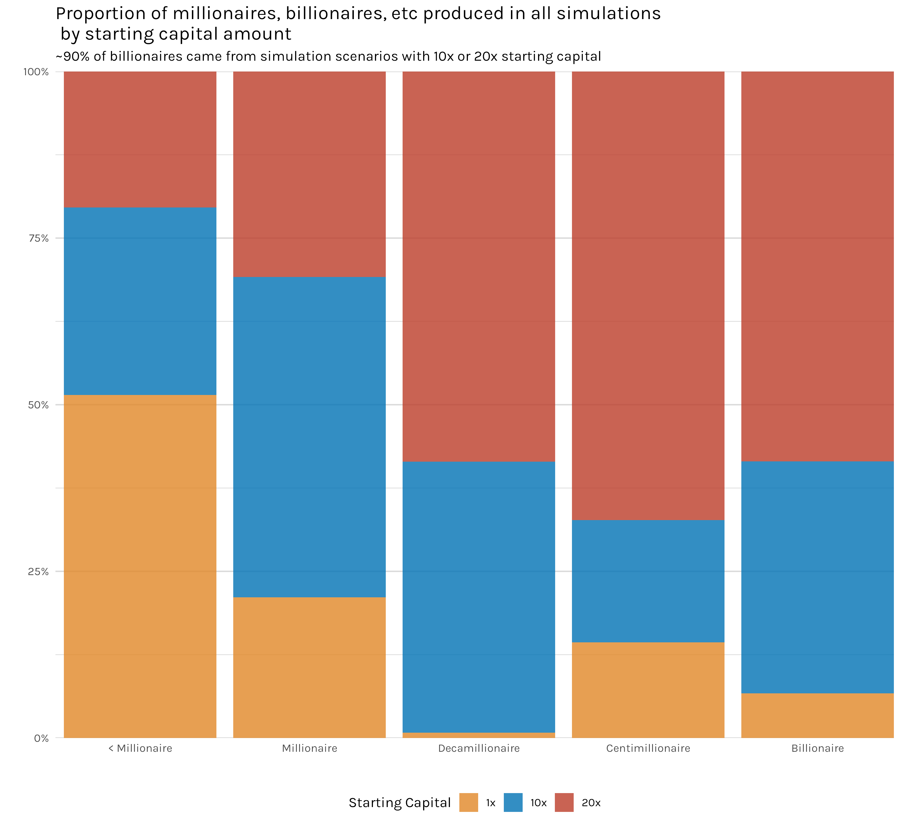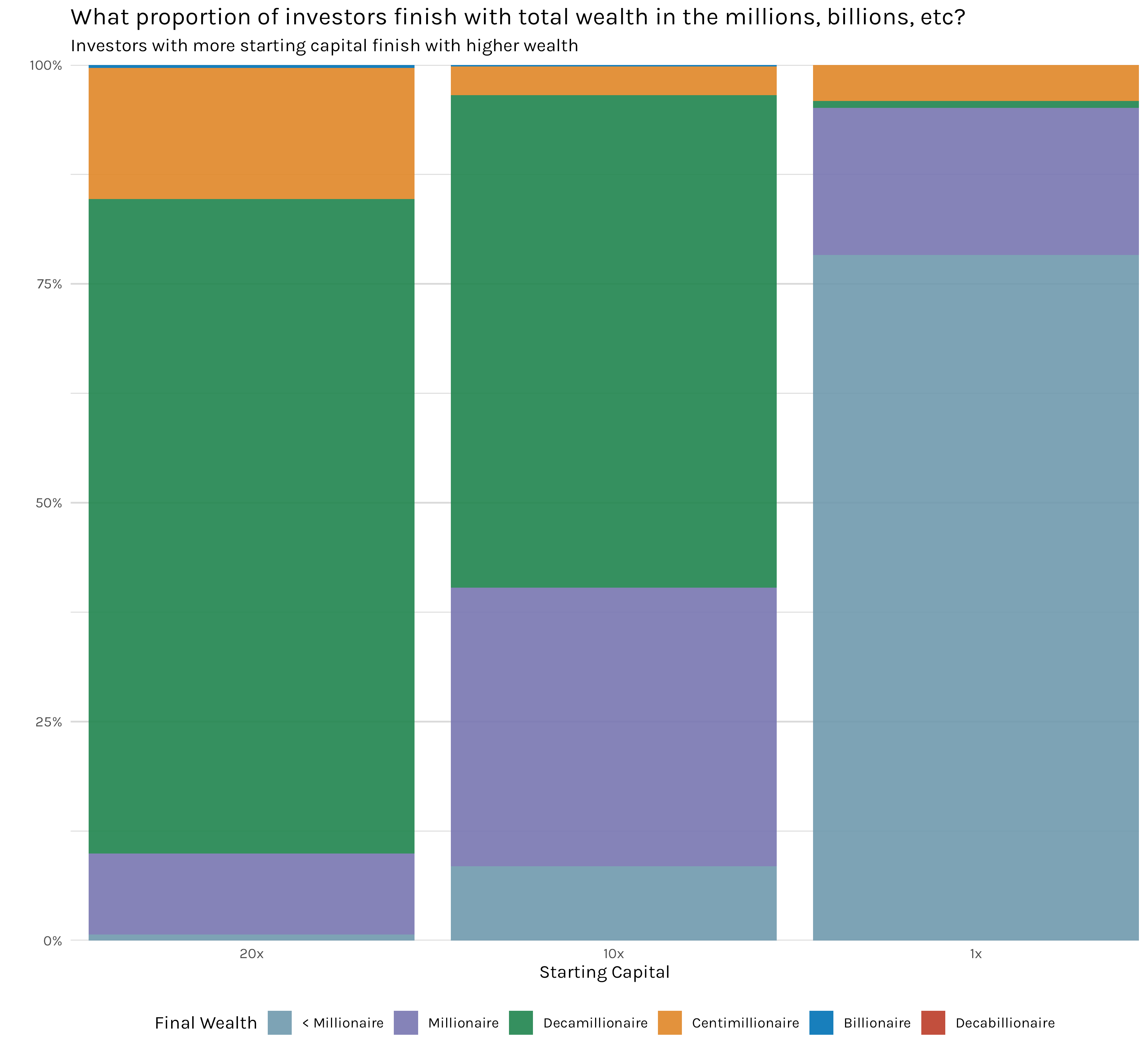 Perhaps this is even clearer if we take the data from all our simulations(except the handful with different reinvestment percentages) and tally up how many millionaires, billionaires, etc we have. That is 1.8 million simulated investors with 600k investors for each starting capital amount. Figure 10 is the result. You can see immediately that the overwhelming majority of centimillionaires and billionaires came from 10x or 20x capital simulations. This isn’t something that is statistically marginal and we should probably do a hypothesis test or something to be on more firm footing. In my opinion, this is one of those ‘oh, this is obviously true’ plots.
