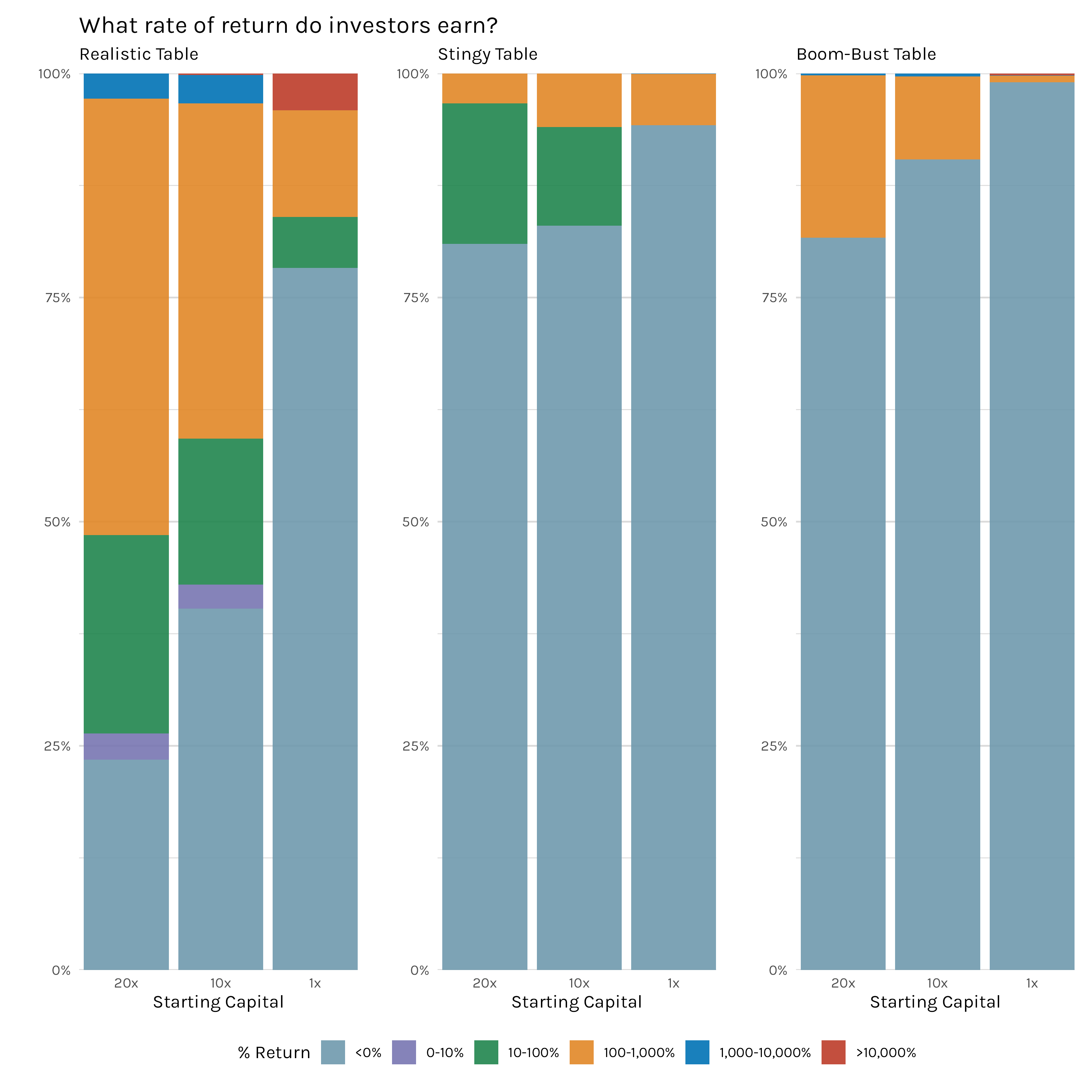 Figure 8 shows investment return percentages for each of our starting capital amounts and for the three different return tables we’ve used in our simulations. What’s perfectly clear is that the number of investors who make money decreases as your starting capital decreases. As we can see in Table 1, the percentage of realistic table investors who lose money drops from ~78% of 1x investors to merely ~23% of 20x investors. Looking at investors who made money, in our realistic investment table, over 50% of the 20x capital group made at least 100% returns on their investments. Putting that in real numbers, that means since they started with $20 million, over 50% of the 20x investors at least doubled their capital to $40 million. Our 10x starting capital group still has nearly 40% of investors making returns of 100% or more, but we have to be careful with our interpretation here. A 100% return for our 10x group is ‘only’ $20 million. For our 1x group, ~15% of investors earned at least 100% returns, but that real dollar amount is now ‘only’ $2 million.