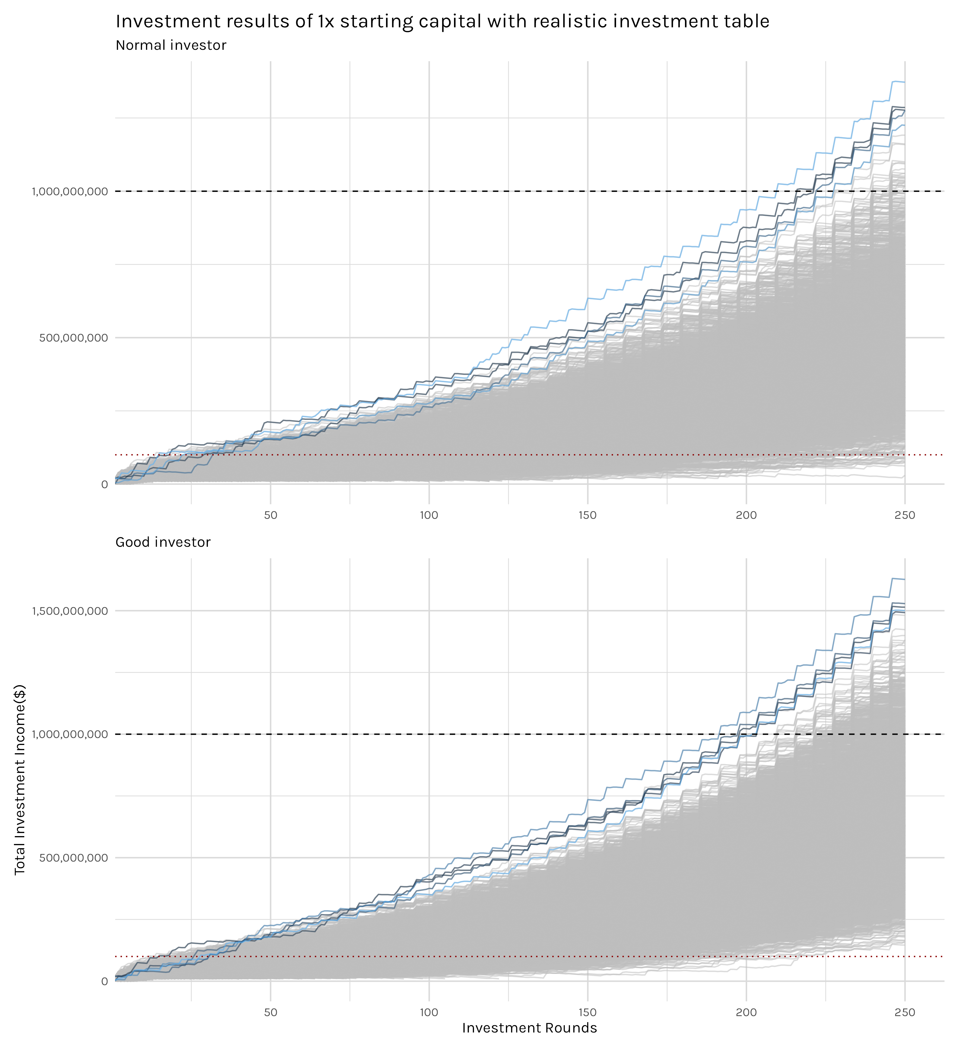 A good starting point is examining what I’m calling racing plots(even though I think racing plots are normally animated). In these plots, each grey line represents the investment results of a single investor round-by-round, with the red dotted line indicating $100,000,000 and the black dashed line indicating $1,000,000,000. The main use case for these racing plots is, I think, to get a sense of the growth rate of successful investors.