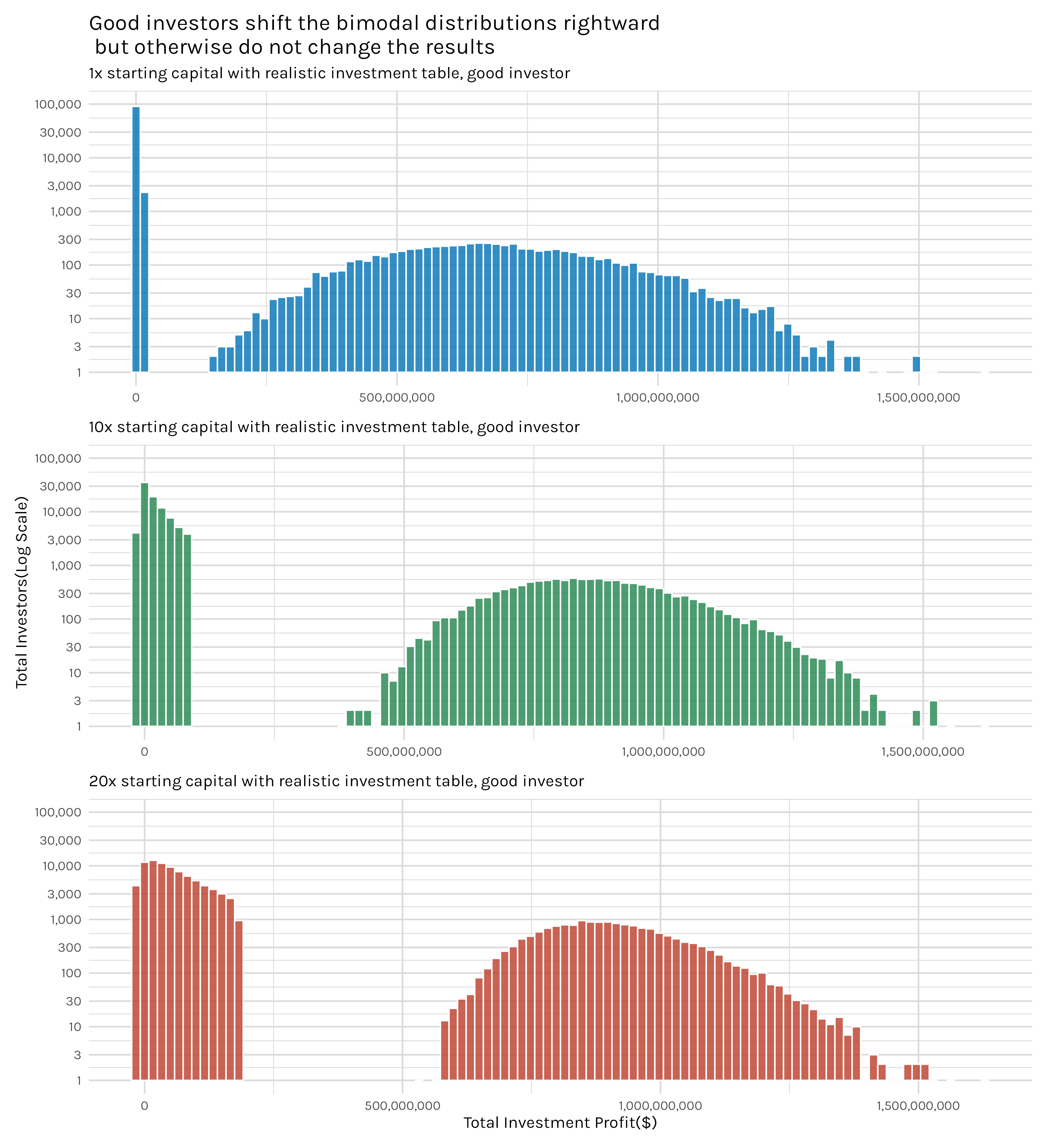 If we take it a step further and ask whether these dynamics change with good investors, the answer seems to be no. Figure 7 shows that good investors appear to push a few more investors into the right hump of the histogram and make those winners make a little more money, but the same patterns are in play. With the 20x investors, this shift appears to be the most exaggerated, but I’d still hesitate to say something is fundamentally different with the good investors. We still have pronounced bimodal data and we still see roughly the same overall shape, just squished upward a tad.