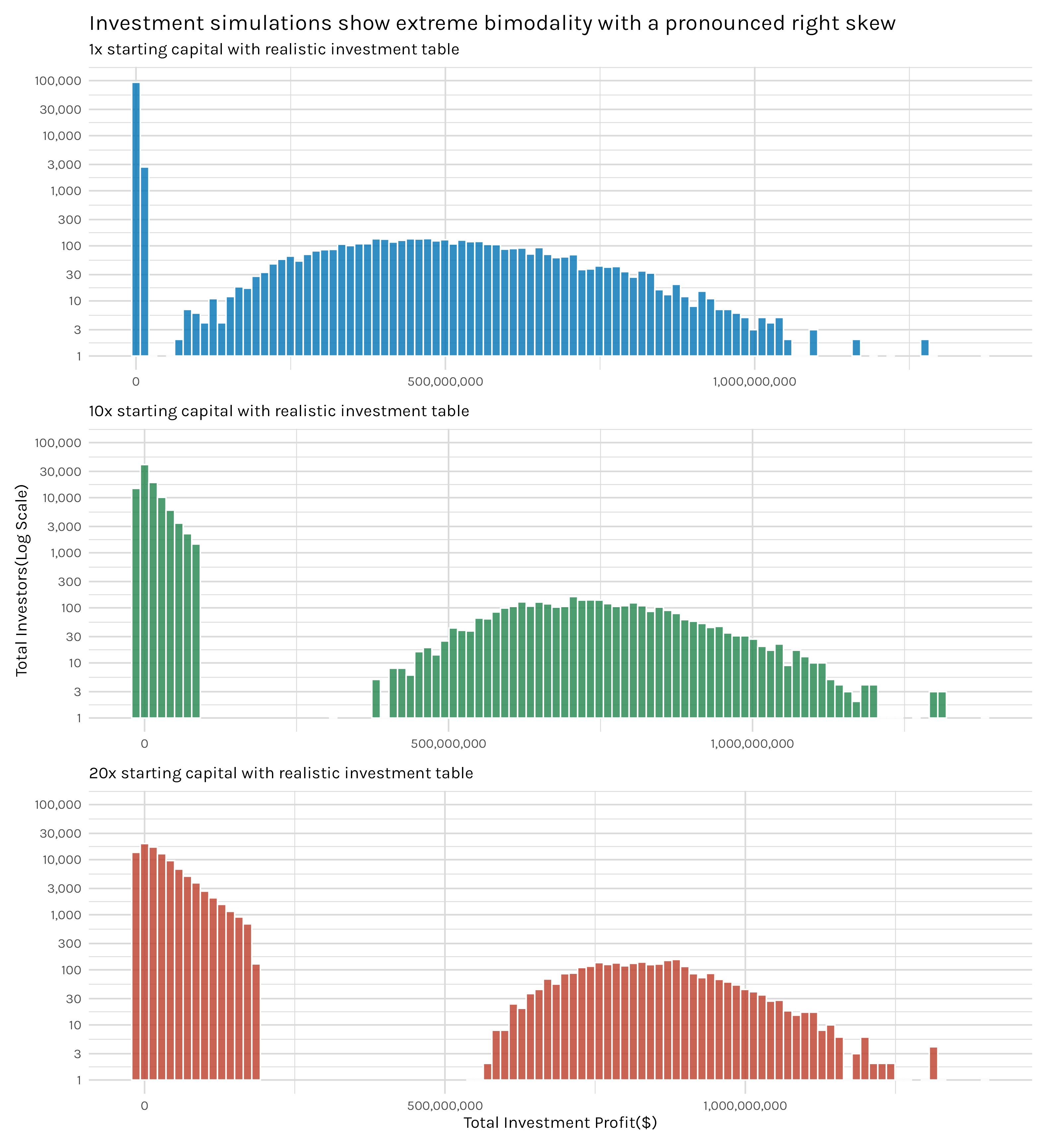 While the racing plots are pretty cool and an OK way to illustrate a bunch of different individual investor results, I’m left a little unsatisfied by them. We got a good sense of what the growth of the successful investors looked like and maybe a sense of how many billionaires were produced, but if you only look at the racing plots, it might seem like every investor in every simulation ends up a millionaire. That is not true, and one option for uncovering this is with our trusty histogram.