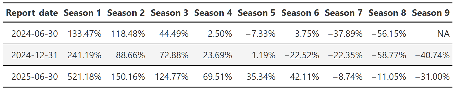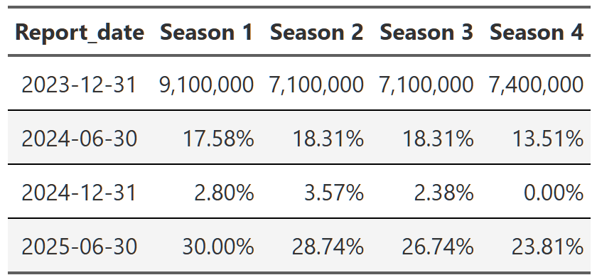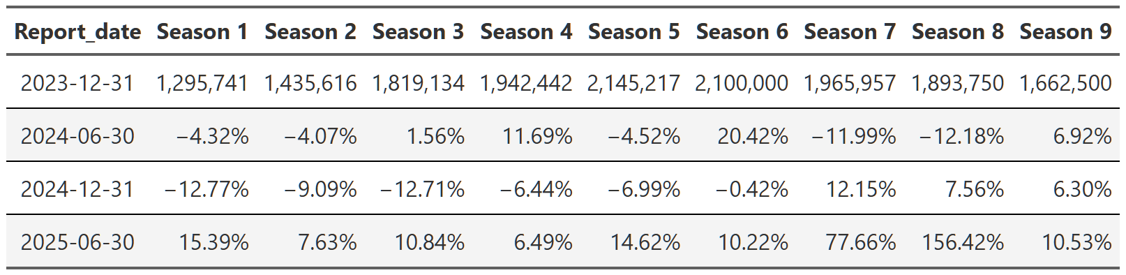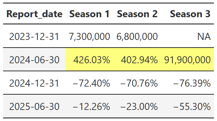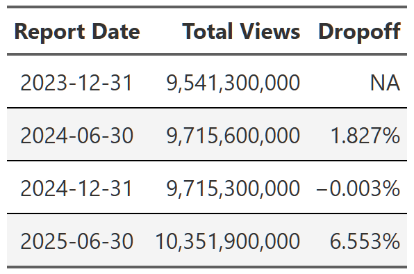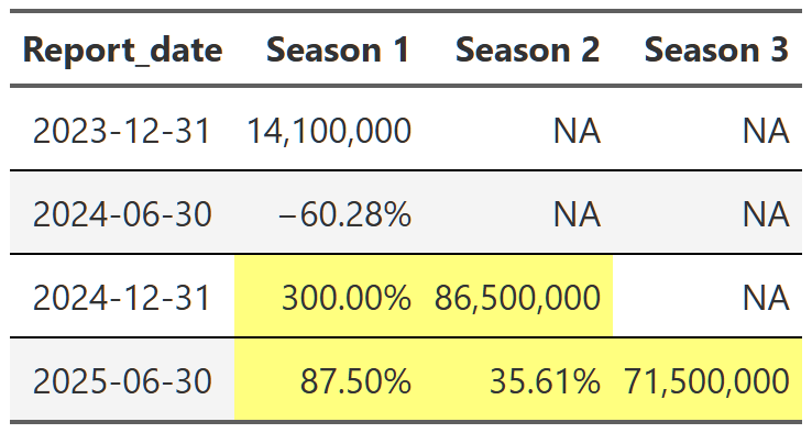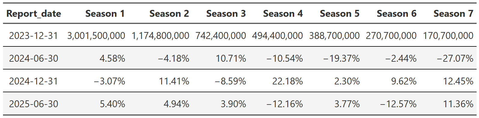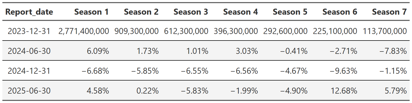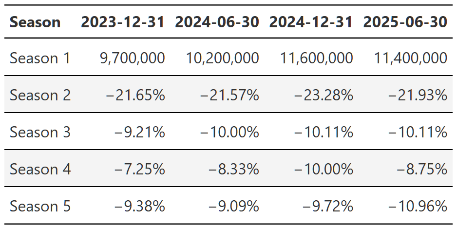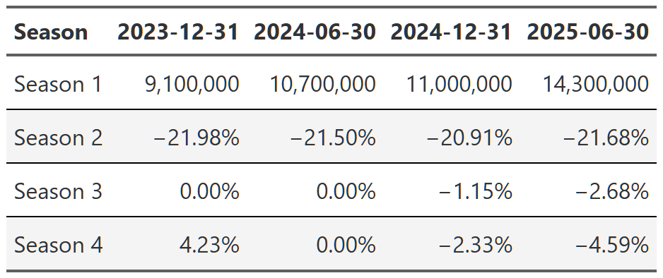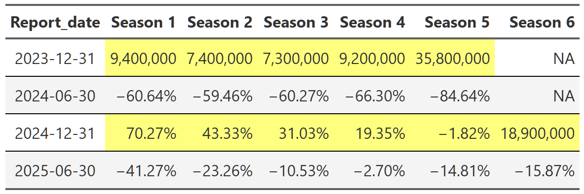 # gtsave(squid_game, "squid_game.png")Table 21, Table 22, and Table 23 show the lift effect of Virgin River, Bridgerton and Squid Game respectively. I think this is a beautiful way to illustrate how a new season pulls up all those older seasons when it releases. For example, in Table 22 we see that the release of the third season of Bridgerton increased the views of the first and second season by over 400% each. That’s really useful information. And so is the fact that in the next report, all three seasons drop 70% off that peak. These tables are a nice easy way to display this information since I really don’t care about the exact number of views. I just want to see what the lift is and so honing in on the comparison to the last report for each season is precisely what I need. One final point, notice we can also see the back-to-back new season releases in Table 23. While Bridgerton suffered your typical decline in views after a new release, Squid Game avoided that in the 2025 report by just continuing to release new seasons. Why don’t all shows just constantly release new content!?