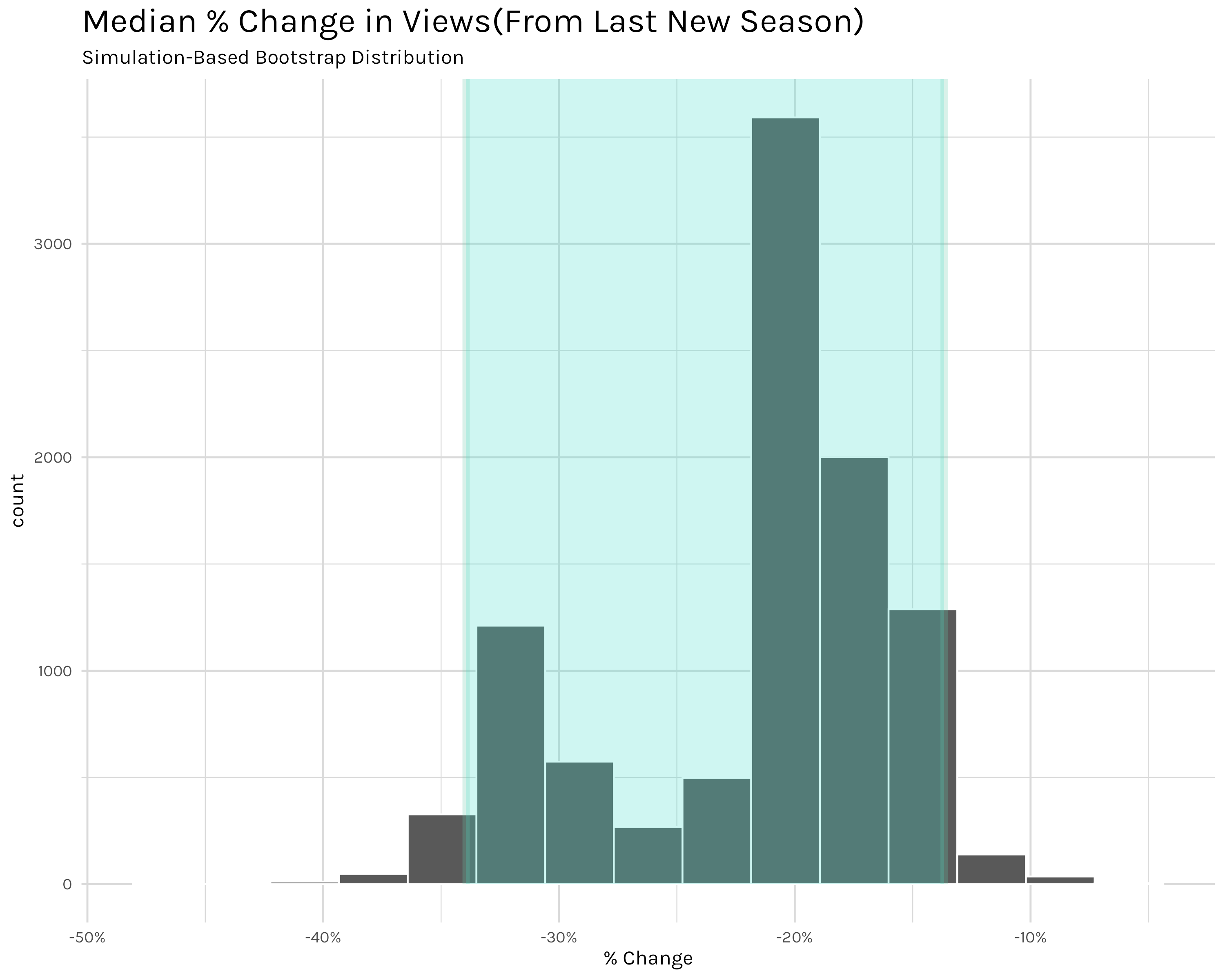 ggsave("ci_bootstrap_dist.png", ci_bootstrap_dist, width = 10, height = 8)Finally we can move on to part two–looking at individual series. With this we are moving away from looking at the ‘typical’ show and moving to the actual behavior of specific shows. I’m still interested in similar questions of new season lift and view decay, but now I’m concerned with how viewership health for Stranger Things or Bridgerton looks. It’s worth noting at the outset that a combination of the two levels–comparing typical show behavior to specific show behavior–is certainly very valuable in a business setting, but I’m not going to be too concerned with that here. I simply want to examine how a handful of shows are doing. I’ll leave the comparative analysis to a curious reader.