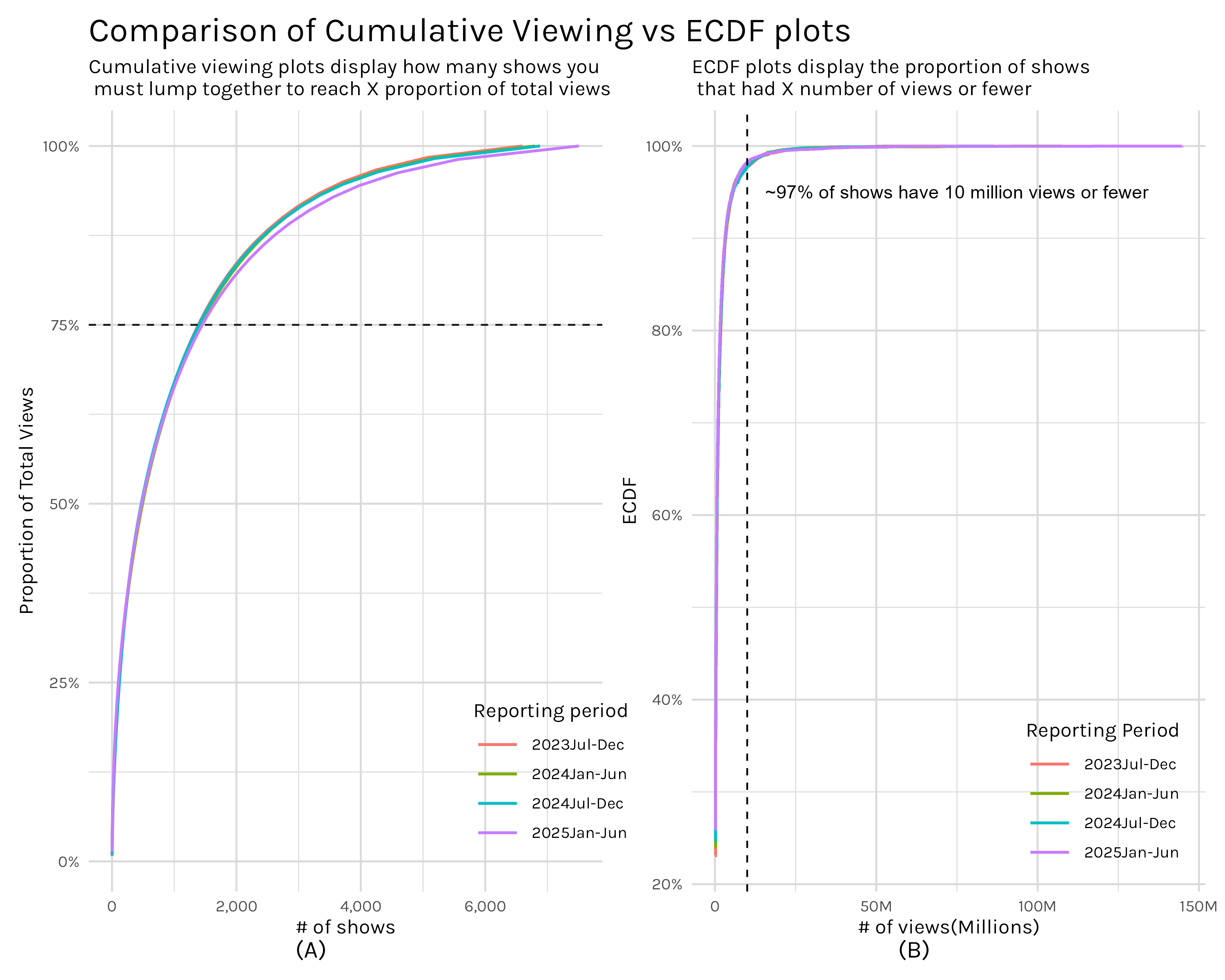 This is not a perfect way to do this grouping. Most, but not all, of the time this grouping captures which period the show debuted in. A small handful of times- when the show debuted before any of these reports or when a new season massively bumps an old season-a show that debuted in a older report will get mistakenly grouped with a newer report. After reviewing the data it didn’t make any difference in this case, so I went ahead with this simpler, imperfect grouping.↩︎