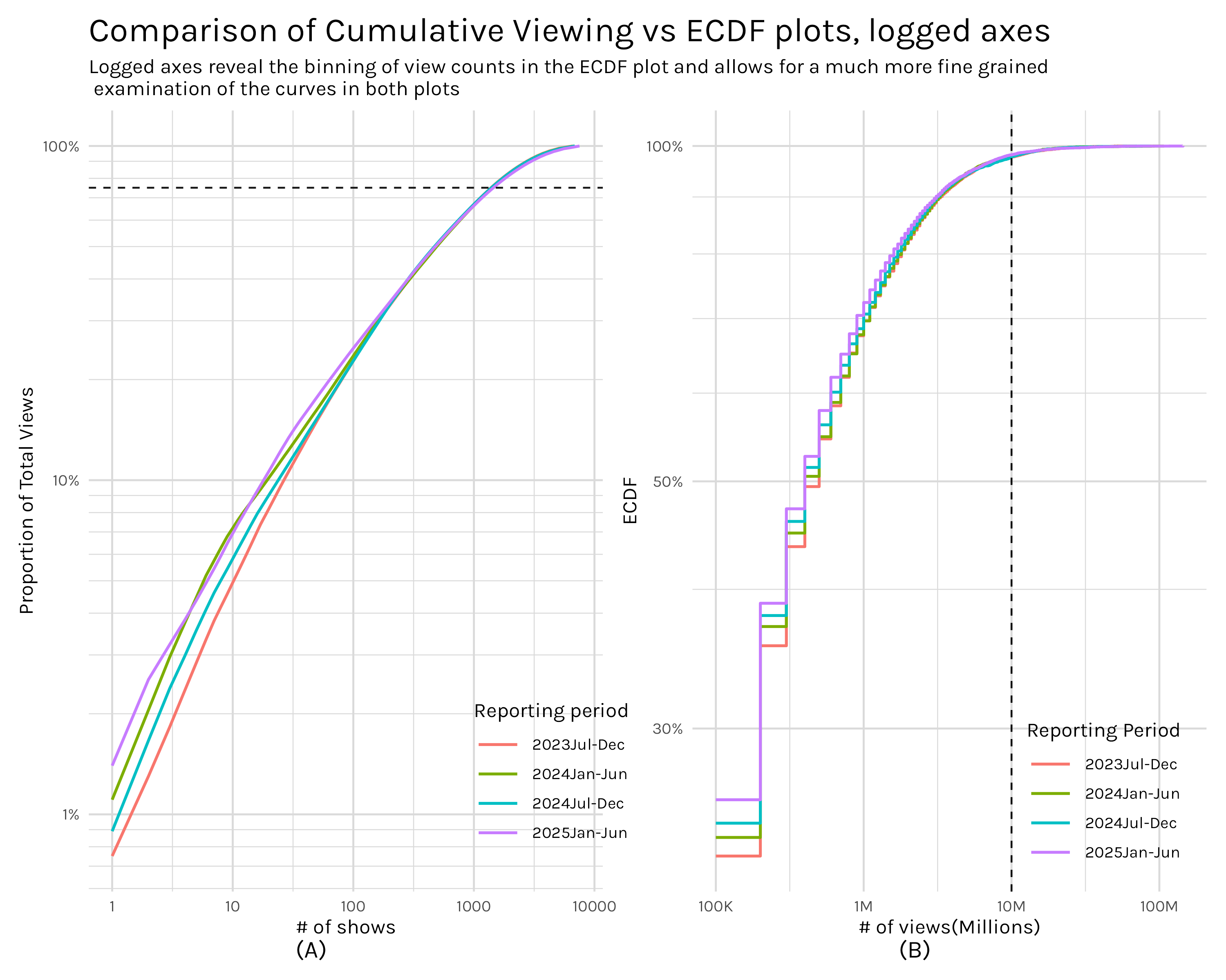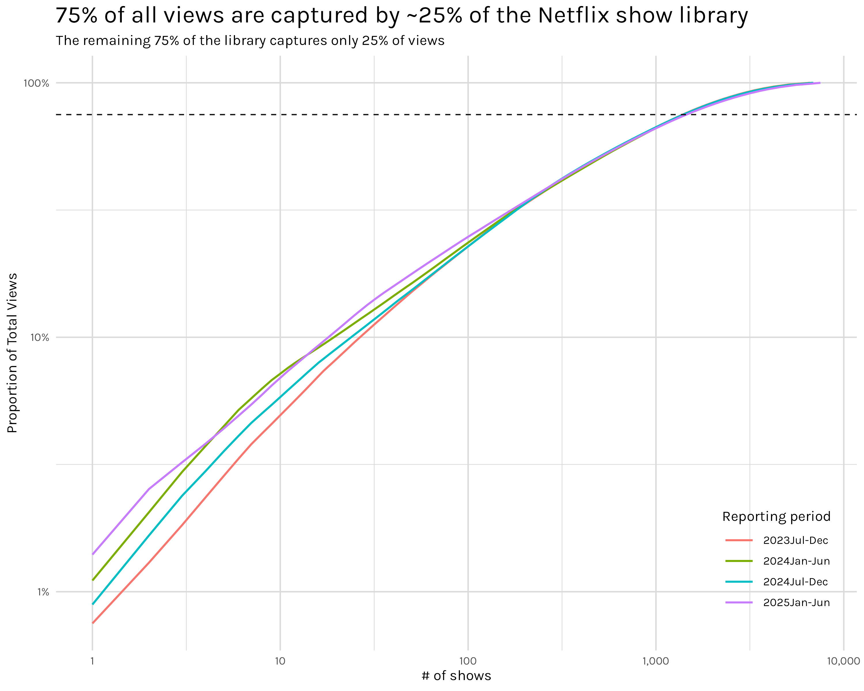 The dashed line here is the same 75% of total views indicator from Figure 2, but the log scale on the y-axis shifts the line upwards relative to the x-axis.↩︎