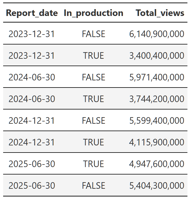 summarise(total_views = sum(views, na.rm = TRUE), .by = c(report_date, in_production)) |>