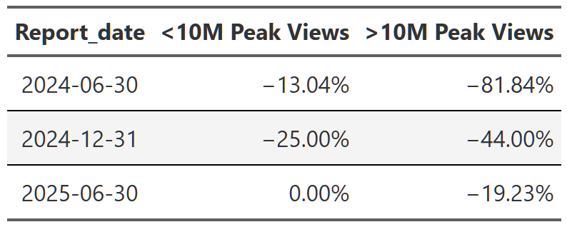 The most interesting data point in Table 14 is probably the Squid Game column. You can see that it exhibits the typical explosive growth expected when a popular series releases a new season, but even for these shows ~1,800% is high. And how does it manage to maintain over 100% growth the following report as well? Well, not to get too into the weeds here, but this is for two reasons. One, Squid Game is one of the few(only?) shows to release a new season in back-to-back reports–the second half of 2024 and the first half of 2025. This means it gets a kind of double jump increase in views during those reports. Secondly, the release timing of the new Squid Game seasons reveals a limitation of the way this analysis is done. The second and third seasons of Squid Game released five and three days before the end of their report periods respectively. This means that a huge chunk of their lift views are actually in the following report, not the report in which they were released. There is not a lot I can do aside from acknowledging this, but the effect is that season two’s lift is distributed over two report periods instead of one. The same goes for season three, but I don’t have that data yet so I can’t say what the numbers are. The combination of these two factors results in this unusual extended view lift across two reports.