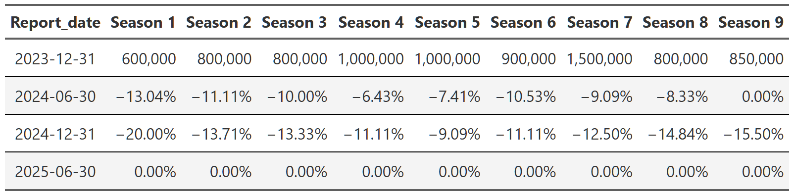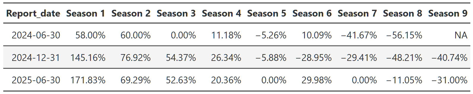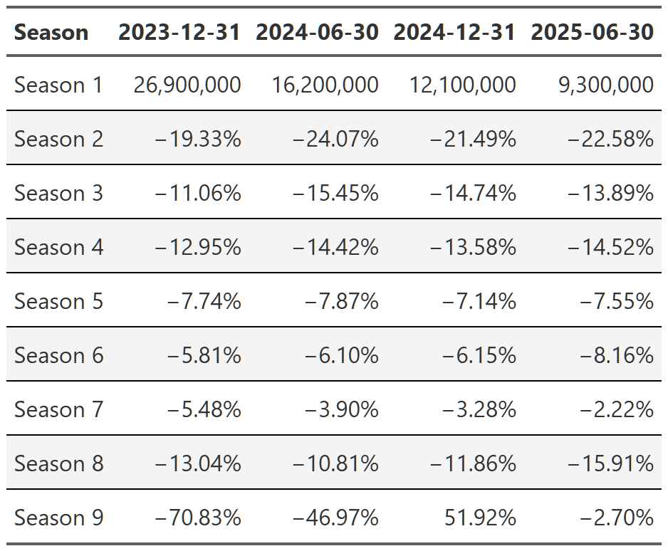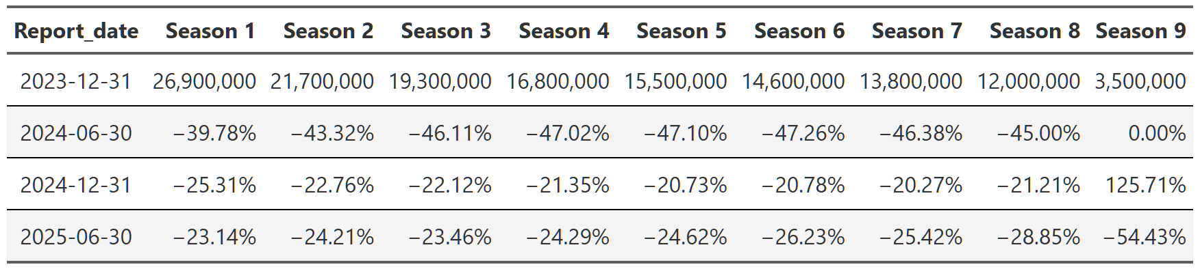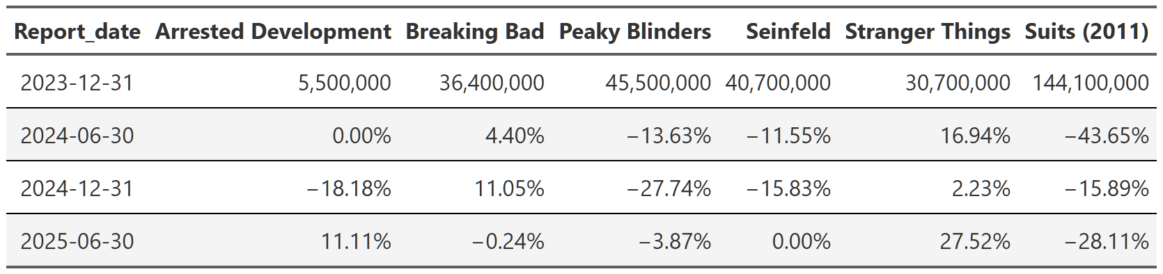 # gtsave(stranger_things_season, "stranger_things_season.png")Table 15, Table 16, and Table 17 show the trajectory of views of Breaking Bad, Suits and Stranger Things respectively. You can see that within each show, the trajectory is quite consistent across the reports. Breaking Bad’s views decline from season 1 to season 5, but within each season the pattern is consistent–views go up a little in the second report, up a bit more in the third and then are more or less flat in the 2025 report. Remember, each percent is the change from the previous report. That means with Suits, we see season 1 views drop ~40% in the first 2024 report, then another ~25% in the second half of 2024 and finally another ~23% in 2025. So we again get the ~65% drop in views from the first to the last report, but this time we can see it’s happening consistently within each season too.