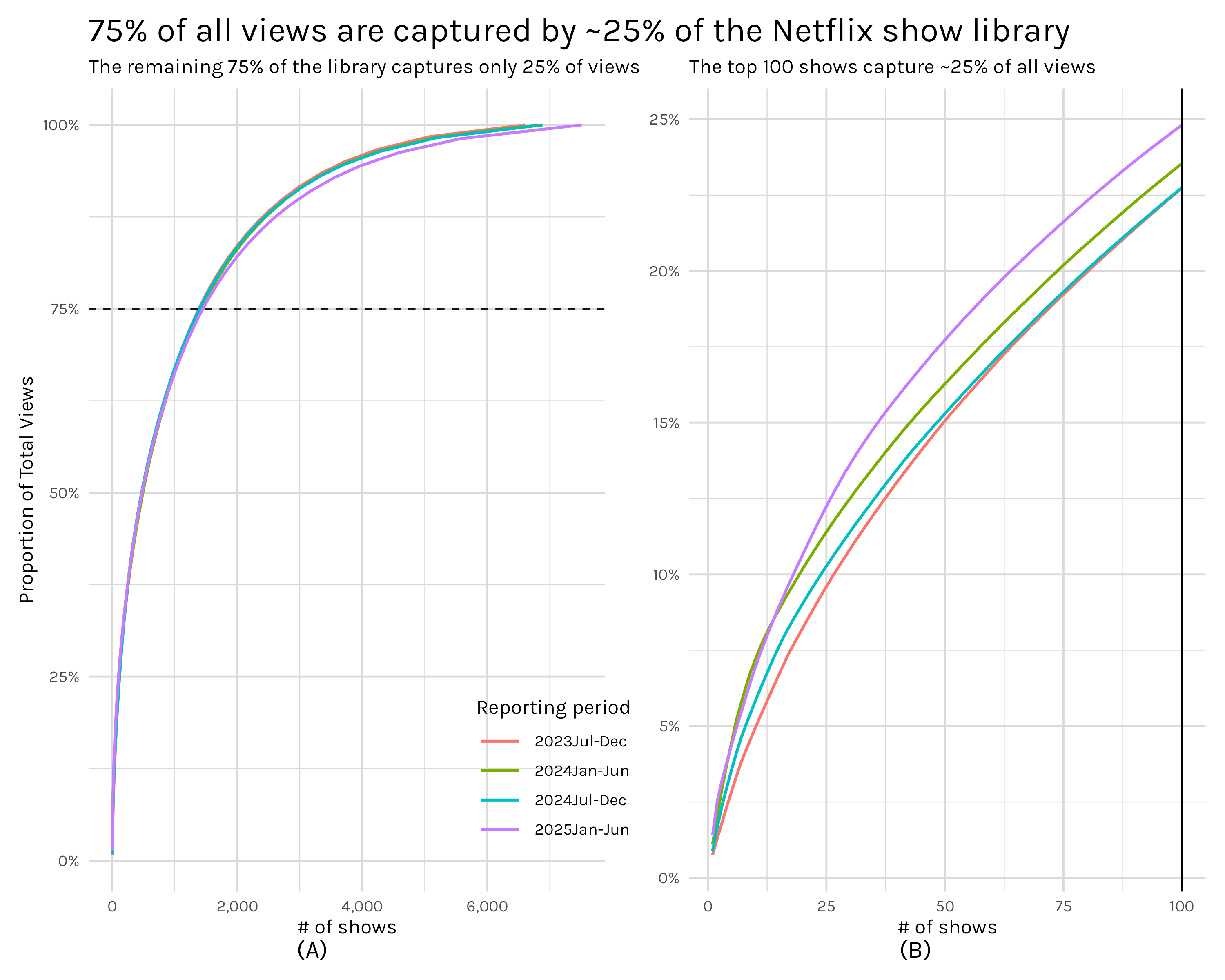Enter the TidyTuesday datasets. The July 29th, 2025 TidyTuesday dataset was a bundling of the engagement reports that Netflix releases every 6 months. This dataset featured, according to Netflix, 99% of all viewing of movies and shows for each 6 month period from July 2023 - June 2025. When I first found this dataset I was just finishing up my Seattle library post, but I immediately knew I wanted to see what the cumulative share plots would reveal for the Netflix data. So in this post I have two ‘simple’ goals: