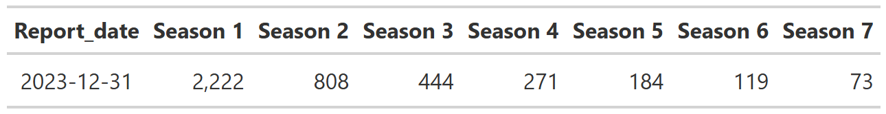 filter(new_release == 'New Season', show_type == "Multi Season", startsWith(season, 'Season ')) |>