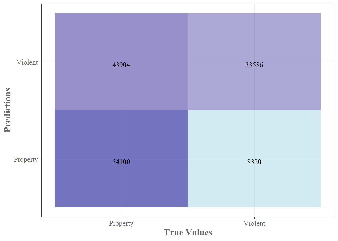 As you can see above, the data set is quite unbalanced. Louisville sees 2.3 times as many property crimes as violent crimes. In my test modeling, leaving the data this imbalanced significantly reduced the accuracy of the model. To address unbalanced data, you typically either upsample or downsample the data. With upsampling you are effectively making random copies of the smaller class until the classes are even. With downsampling you are removing data from the larger class until they are even. While, in general, it’s not a good idea to throw away data, in this case the performance was very similar. Since upsampling had similar performance but much longer training times, I ended up using downsampling.