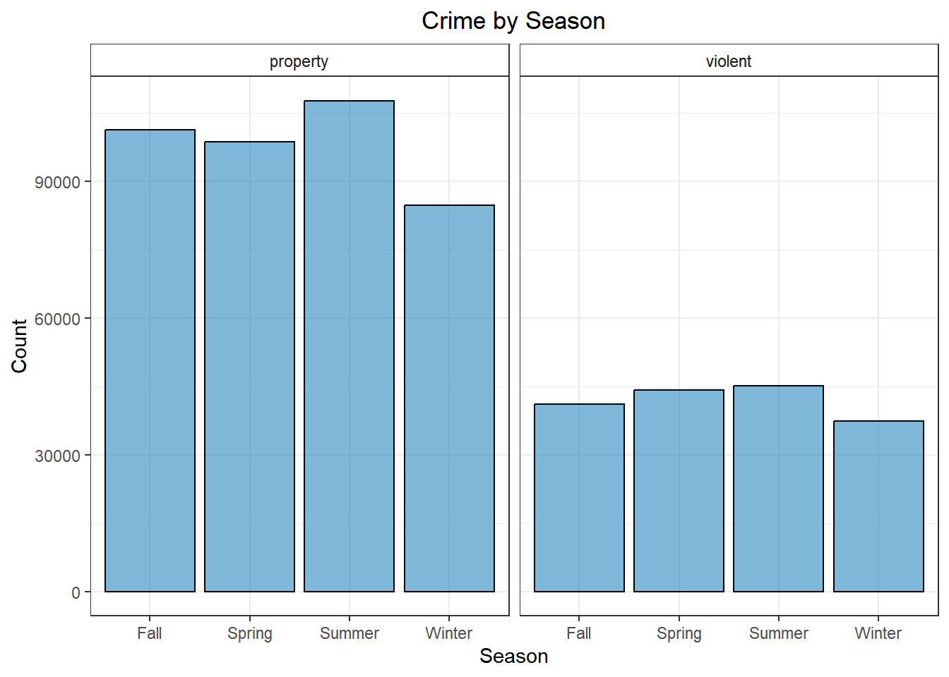 Looking at some quick, exploratory plots, it’s pretty easy to see that there are small, but noticeable differences in many of variables. We tend to see more violent crime on the weekend than on weekdays. With property crime, this is reversed. Similarly, there are more violent crimes in spring/summer than in fall/winter, but for property crimes we only really notice a slight bump in summer and then a sharp drop during winter. These are the sort of things our logistic regression model should pick up on to fit the model.