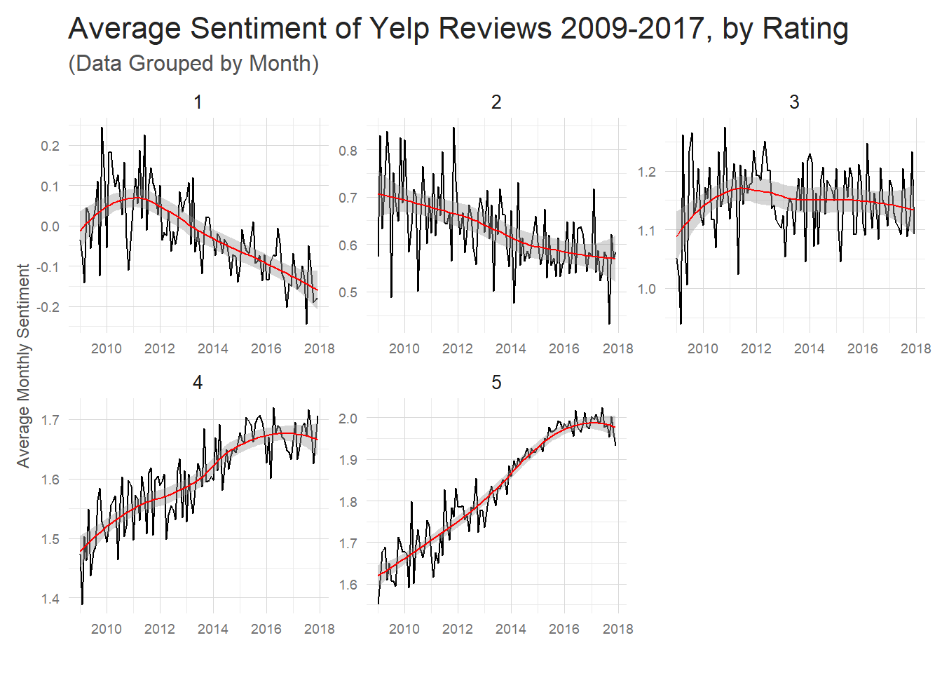 title = 'Average Sentiment of Yelp Reviews 2009-2017, by Rating',