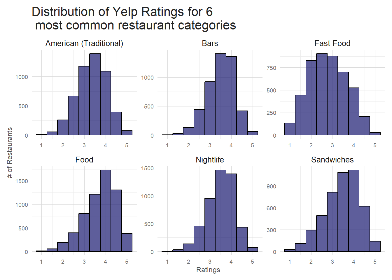 When I look at how ratings are distributed by category, I start to see some variation. Below are the 6 most common restaurant categories and their ratings distributions. While ‘Food’ and ‘Sandwiches’ look similar to the distributions I have seen so far, ‘Fast Food’ is quite different. The skew is reversed–a majority of restaurants have 2-3 star ratings instead of 3-4– and the distribution is much wider. ‘Bars’ and ‘Nightlife’ are narrower distributions with more pronounced peaks and ‘American’ is much closer to normal than the others.