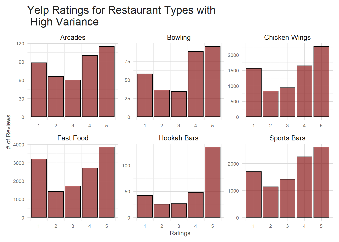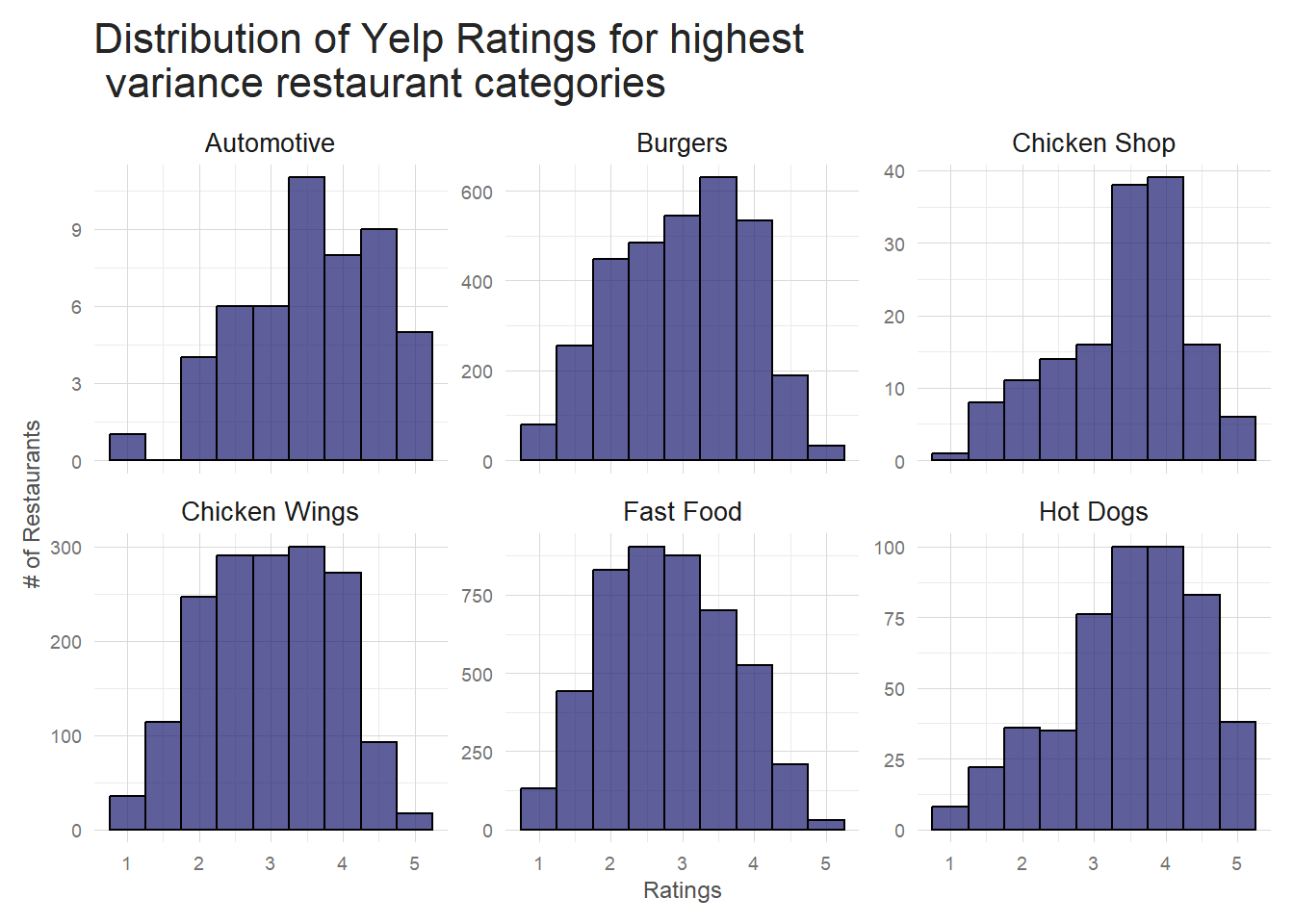 Notice that automotive is high variance, but the number of restaurants with the automotive tag is very low, so it’s very possible that this distribution doesn’t have enough data to be trustworthy. The others make sense though– at least in my opinion. Aside from automotive, these are all fast, casual food types where you can see a wide variety of customers and a wide variety of quality. A good burger to one person is awful to another just because of the peculiarities of taste.