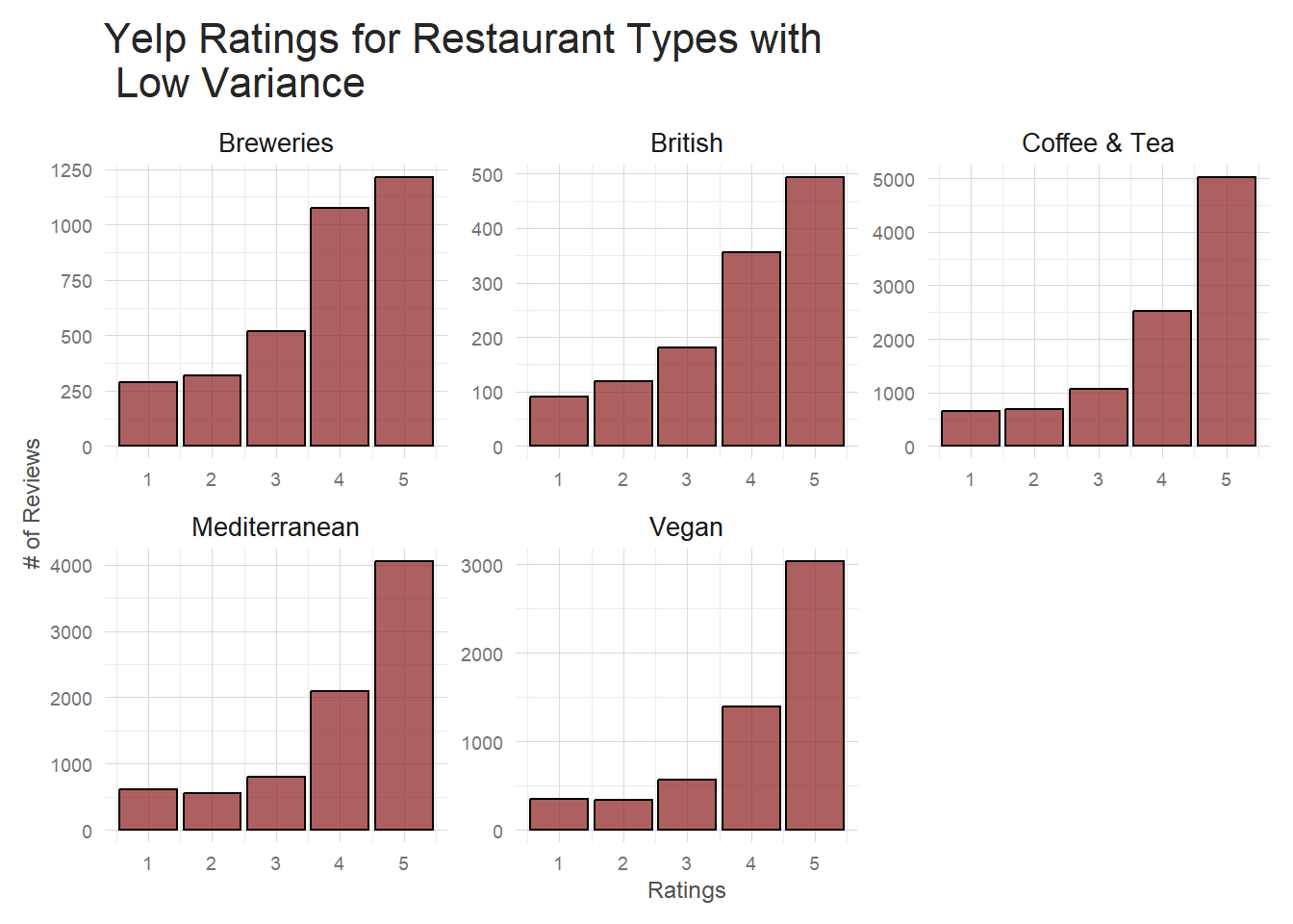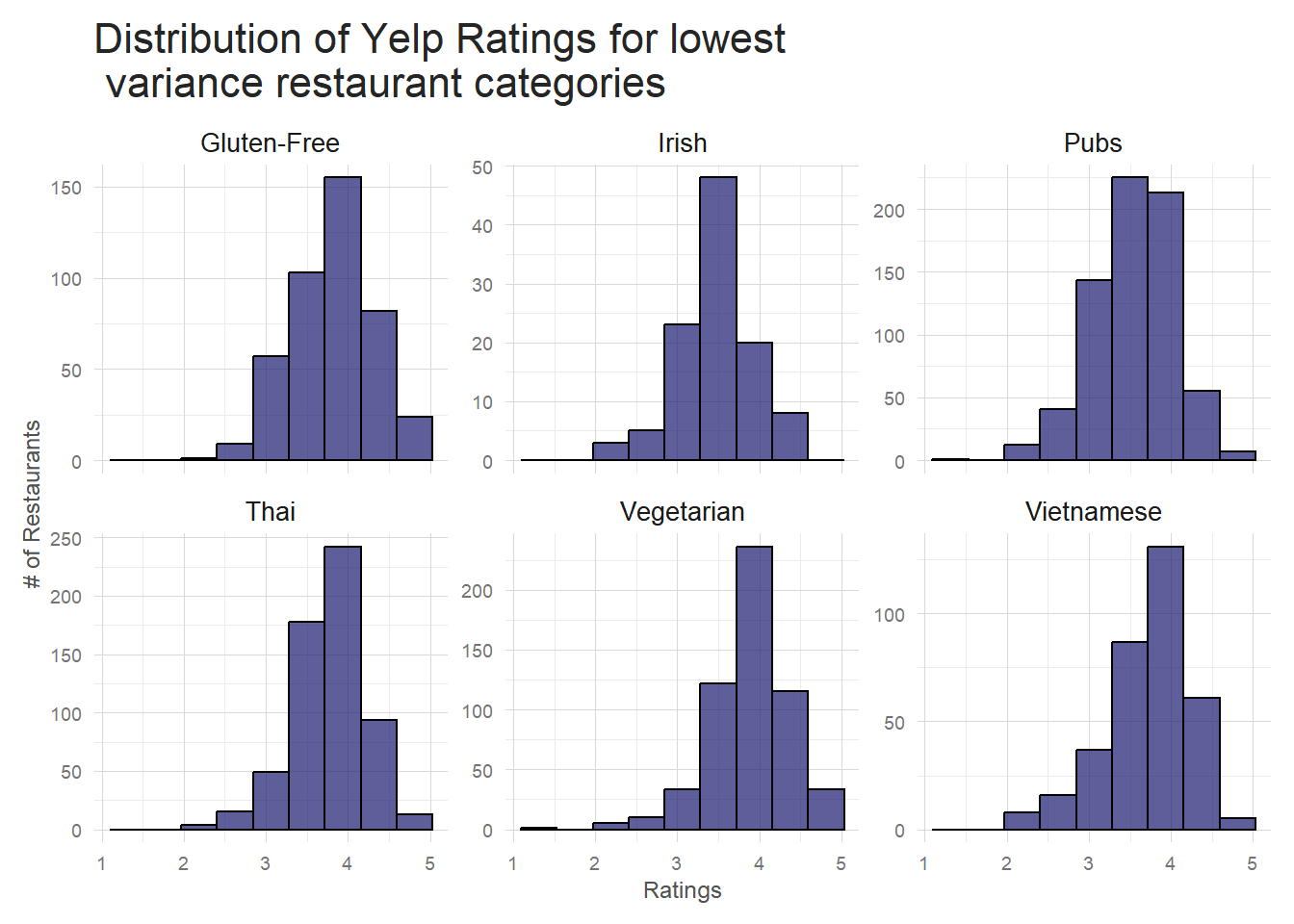Conversely, if I look at low variance categories I see they tend to be more niche. My guess is that the clientele at these sort of restaurants knows, generally, what to expect, and so they are less often ‘surprised’ (in both good and bad ways) by the food. That’s just speculation though, so who knows. Note: the low variance plot is actually a sample of the low variance categories because there are ~30 categories with a similar variance at the low end. Make sure you use the same seed I did if you want to replicate the plot.