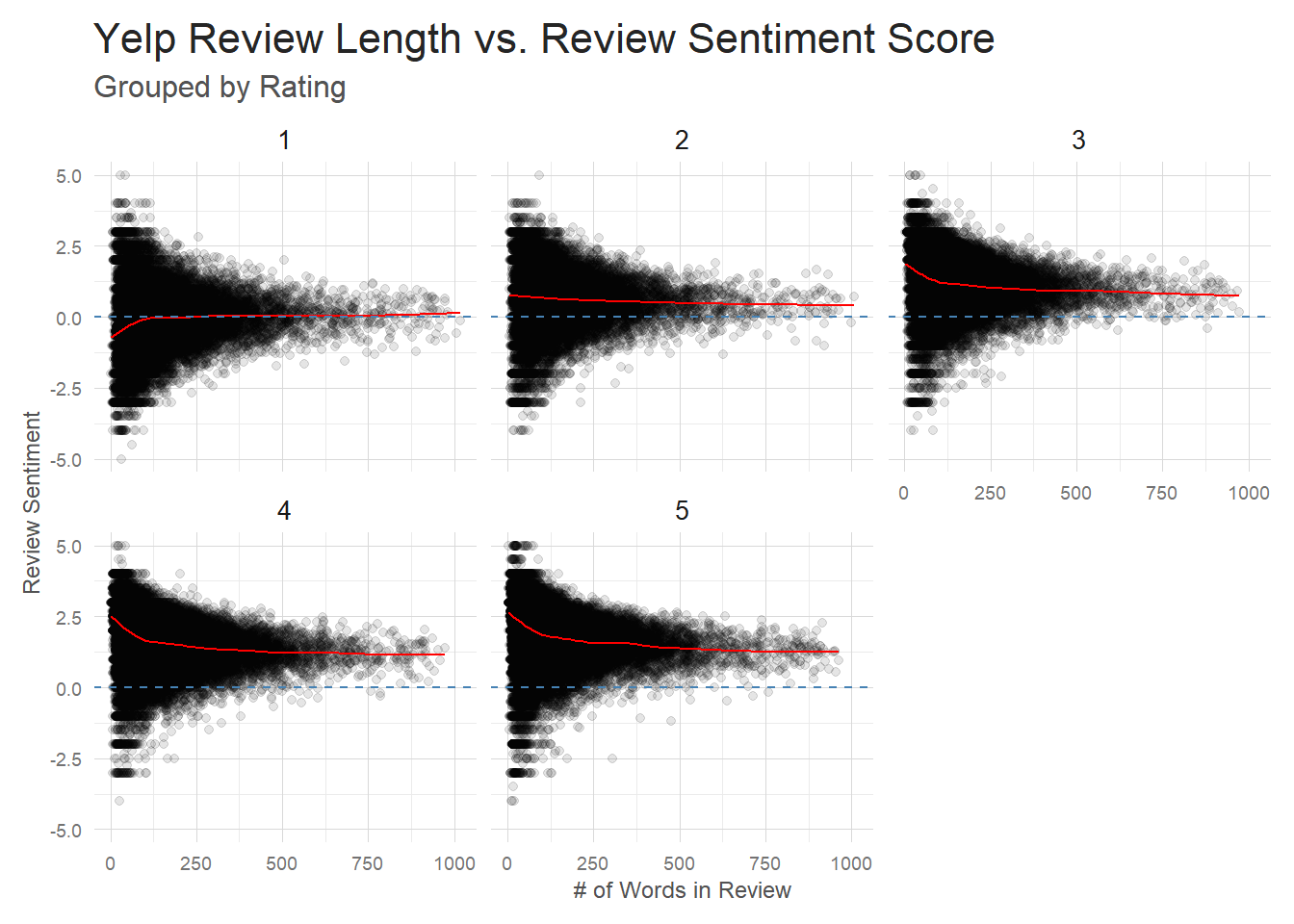 Even with all that bad news about sentiment analysis, I can still use it to gain some valuable, subtle insights. I can see that shorter 4 and 5 star reviews tend to be very positive. Looking into those reviews, you see a lot of ‘Outstanding food, and some random sentence of praise here’ reviews. Short, sweet, and very positive. As we get longer reviews, it’s not that these ‘outstandings’ disappear, it’s that they are moderated by a plethora of other words in the longer review. It’s essentially a regression to the mean effect. You see that in the trend line drifting down to a slightly lower sentiment. Similar effects are seen in the 1 star reviews, but in the opposite direction. Reviews gradually trend more positive as the length of a bad review grows–all the starkly negative words are averaged out with more moderate sentiment words.