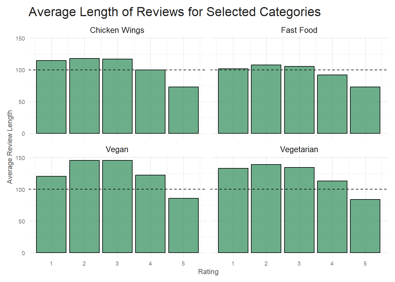 I want to briefly examine the issue discussed at the end of section 3.2.2. Am I able to discern differences in the text of reviews between categories. Using information I gathered above, I’ll filter down to reviews for a couple of the highest variance (Fast Food and Chicken Wings) and a couple of the lowest variance(Vegan and Vegetarian) categories.