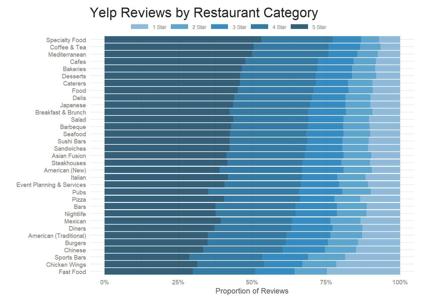 While viewing the distribution this way is informative, ultimately I’m using the overall rating for all restaurants of category X to build the plots. I actually have individual review level data though, so I should take advantage of it. I can gather up the many thousands of reviews about, for instance, Chinese restaurants and use those to display the breakdown of each categories reviews. This will give a nice tidy view of how reviews of each restaurant category vary.