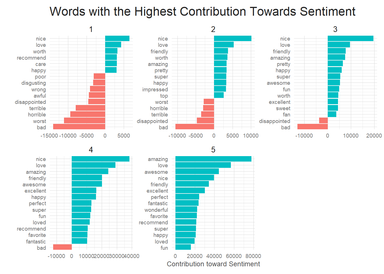 As you can see below, the contributions look quite different for each separate rating. 1 star reviews are overwhelmed by words such as bad, worst and horrible, while 5 star reviews are dominated by positive words such as amazing and love. It’s important to, again, point out that sentiment analysis by word won’t catch certain intricacies of the English language. I have a feeling if I were to look at bigrams of review text, I’d see that what actually occurs most often in 1 star reviews is ‘didn’t love’ or ‘not recommend’ rather than ‘love’ and ‘recommend’. This sort of negation is missed by word level tokenization, but could be easily captured by bigrams if you were so inclined.