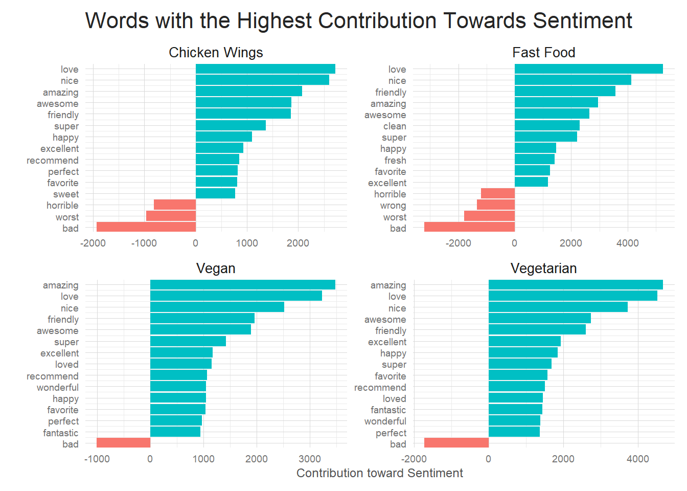 And finally I decided to do the same sort of sentiment contribution analysis, but focus on our selected restaurant categories. The differences aren’t as noticeable here, but some word contributions still stand out. Fast food has a lot of contribution from ‘clean’ and ‘fresh’ and ‘wrong’ while those words don’t show up in any of the other 3 categories. I imagine Fast Food reviews focus on slightly different signals than other restaurants. Since fast food is standardized across restaurants, the differentiating factors are things like the restaurant being clean, or the fries being fresh, or your order being wrong. These are all things that are taken for granted–more or less–at non-fast food restaurants and so maybe these factors rise to a higher level of importance for the fast food category, resulting in their appearance in more fast food reviews.