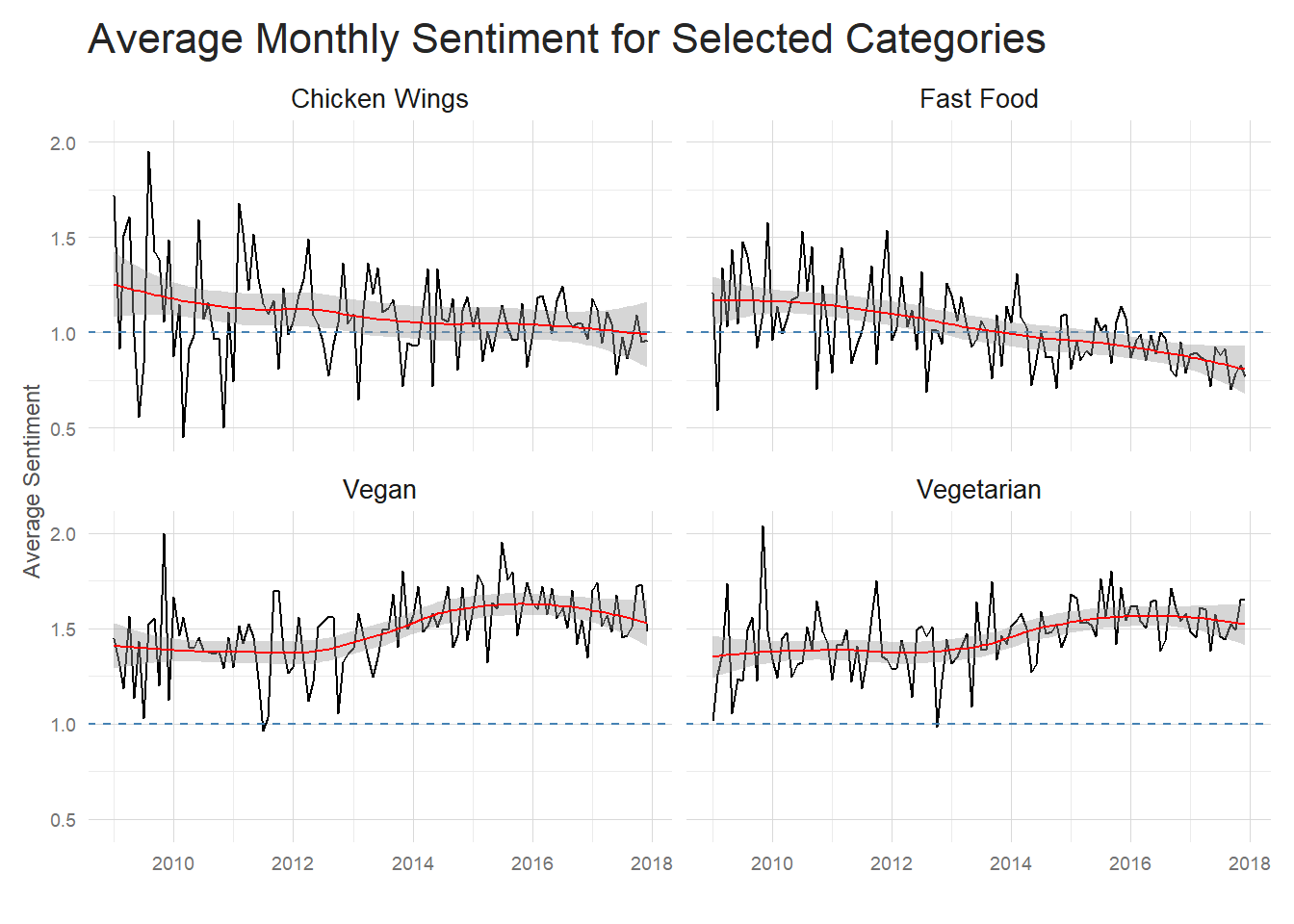 For now, I can say that sentiment for Chicken Wings and Fast Food has trended down over the past several years while Vegan and Vegetarian may have seen a mild increase in average sentiment.