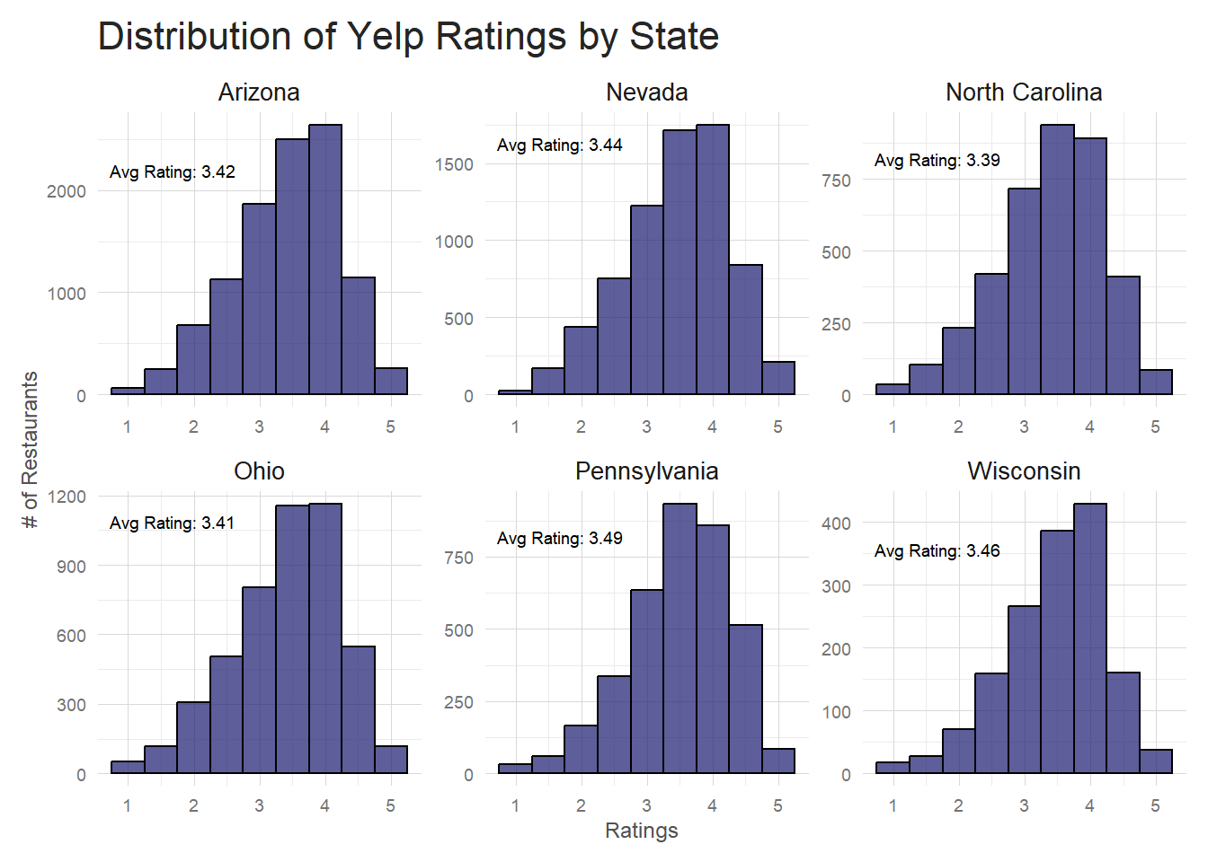 Does this distribution look different state to state? If I filter out the states that only have a small number of restaurants, the distributions look pretty similar state to state. All state distributions are negatively skewed with very similar averages. Just from a first look, it doesn’t seem like you see a lot of variation in how state’s restaurants are rated.