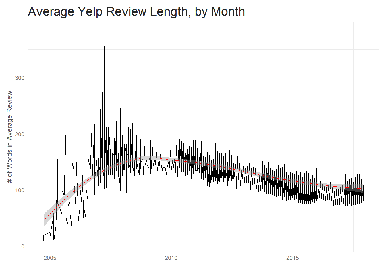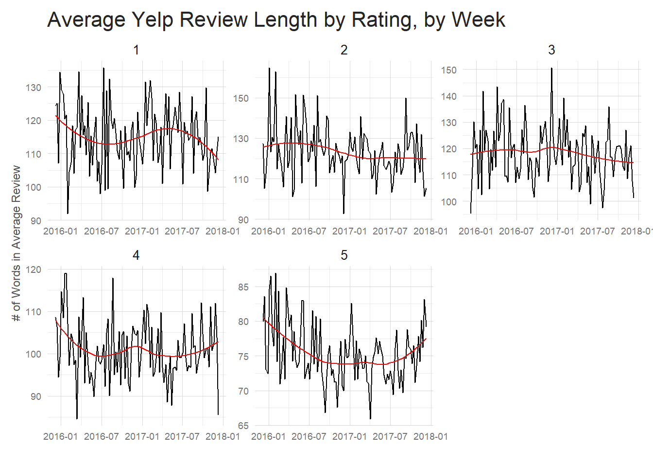 (Note: I decided to filter out reviews before 2009.) This is a pretty amazing insight. It seems that negative reviews have gotten more negative and positive reviews have gotten more positive. Interestingly, if you don’t facet this plot, the average sentiment has stayed pretty much constant since 2009. I’m a little bit suspicious of this drastic of a change in sentiment in the reviews. My gut is that the shortening length of 5 star reviews over time is giving greater emphasis to the words you’d expect in a 5 star review –amazing, fantastic, etc. So the presence of these words in shorter and shorter reviews is pushing up–or down in the case of negative words–the averages over time.