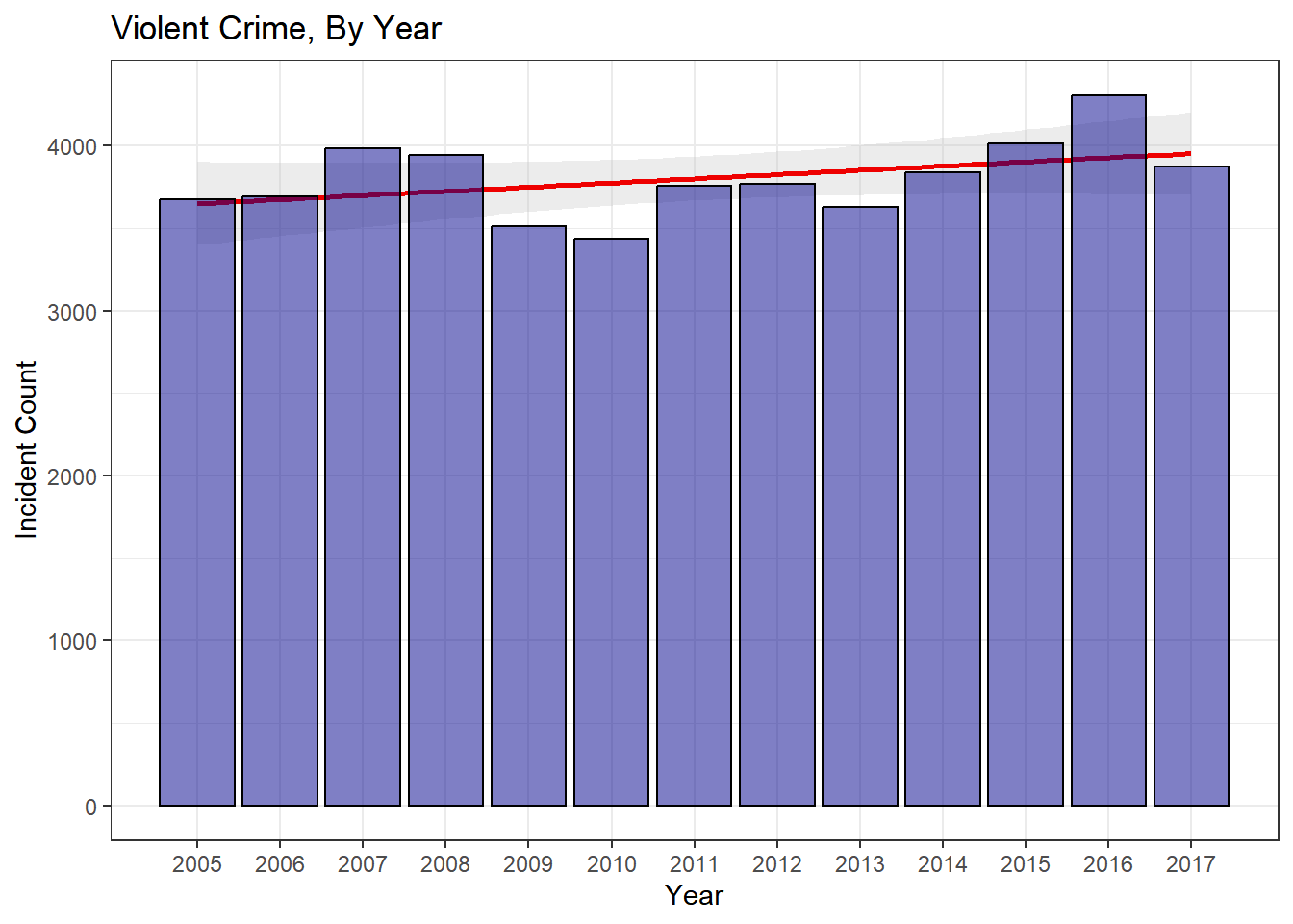 In this specific instance, I am interested in the relationship between the violent crime counts and the year. By looking at the strength of the year to count relationship, I should be able to gain some intuition for just how unusual a year 2016 was for violent crime. Regression modeling is pretty simple in R. I apply the correct filtering and then use the glm function to build a Poisson regression model.