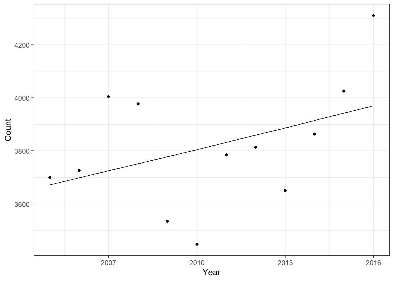 glm(formula = count ~ year, family = poisson, data = df)